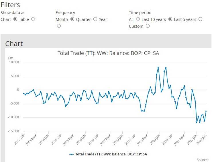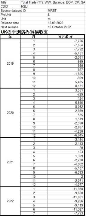 2022年7月の季調済み総合貿易収支は ▲78億ポンド