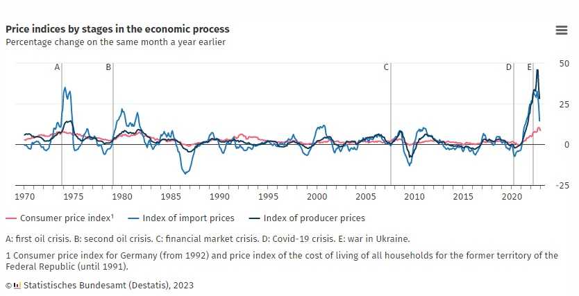 濃い赤い線:ドイツのエネルギー価格(危機のけん引役)
