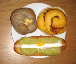 今日の朝ご飯は昨日買ったファミリーマートのケロロパンでした。上段左がドロロのチーズパン、右がクルルのカレーパン、下段がケロロのクリームサンドです。ドロロのパンは生地に黒ごまが練りこまれているので青っぽく見えます。キャラクターの色を意識して作っているみたいですねドロロもクルルもちゃんとそれぞれのマークになっています。ケロロのパンも黄色い☆のチョコレートが乗っています。以前発売していたケロロパンよりもキャラクター色が強く出ているという点ではファミマパンの勝ちかな。旦那がクルルパン、娘がケロロパン、私がドロロパン(とケロロパン少し)を食べました。クルルのは「カレーパン」と言うものの、クルクルの線しかカレーが無く生地が若干カレー味がするかなー・・・という程度だったそうで、かなりガッカリしてましたwケロロパンは緑色の生地はメロンパンの上の部分みたいな感じ。甘くて子供は好きそうですが、ウチの娘には大きかったようで半分ママにくれました。ドロロパンはチーズもおいしいし生地もふっくらだしゴマでヘルシーだし、私はこれがオススメです。クルルカレーパンも今度食べてみようっと。食後はケロロデザート♪もちろんメロン味です。メロン味のゼリー・ムース(なのかな?)・クリームの3層構造です。タママ・ギロロのデザートも同じ構造になっています。どれもゼリーはプルプルッとして美味しかったですが、個人的にはギロロデザートが一番気に入りました。(←若干えこひいき)人気blogランキングへ