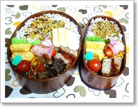 今日のお弁当はこれっ! 雑穀ご飯にふりかけかけて、 おかずはハンバーグ、ウインナーのベーコン巻 卵焼き、ミニトマト、スパゲティー(冷凍食品)、 見えないけど冷凍食品の胡麻和え…、 主人のほうには、たくあんと きのことちくわとごぼうのきんぴらも入れました。 このきのことちくわとごぼうきんぴらはこの本の 500円でわかる!基本の低カロおかず きのことちくわのきんぴらをちょっとアレンジ?して…、 作ったのがこれです。 材料(2人分)です。 まいたけ1/2パック(50g)、エリンギ1本(50g)、 ちくわ1本(50g)、にんじん1/4本(40g)、 酒大さじ2、砂糖、しょうゆ、 サラダ油各大さじ1、七味唐辛子適宜です。 作り方は、 1、まいたけは小房に分ける。 エリンギは長さを半分に切り、縦半分にしてから 5mm厚さに切る。ちくわは小口切り、にんじんは 皮をむいて短冊切りにする。 2、鍋にサラダ油を入れて強火で熱し、1の材料を 加えて炒める。全体に油がまわったら砂糖、酒、 しょうゆを加え、汁気がほとんどなくなるまで 炒りつける。器に盛り、七味唐辛子をかける。 私は材料にエリンギは使わず、まいたけを多めに使って ごぼうを笹がきにして加えました。 それから七味唐辛子ではなく、 白ゴマをたっぷりふりかけました。 簡単でおいしくてヘルシーでとってもいいですよ。 是非お試しあれ…。