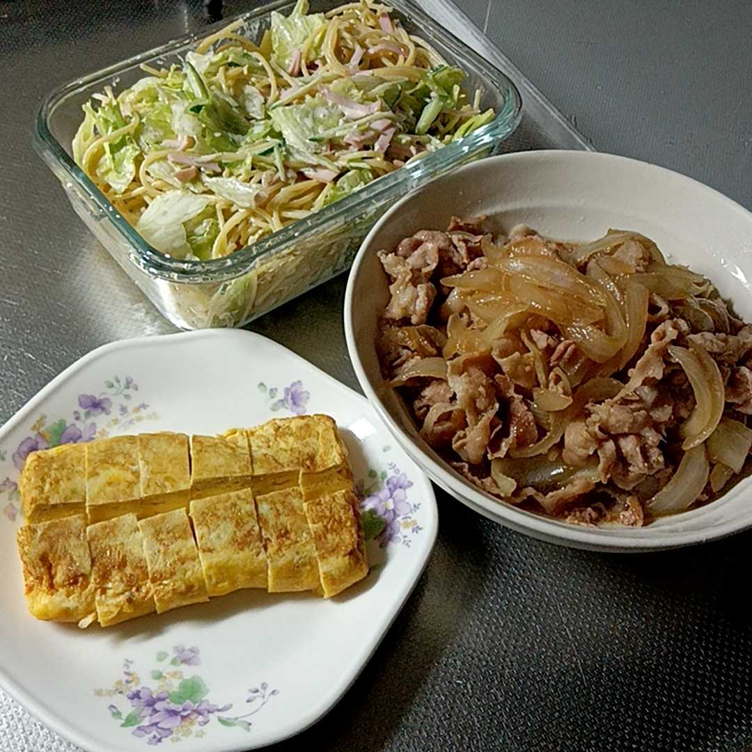 あ、昨日の夕飯は 〖生姜焼き・卵焼き・パスタサラダ〗