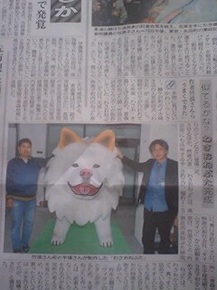 わさおねぶた完成 本物に負けないかわいらしさー。 鯵ヶ沢町のイカ焼き店の人気秋田犬「わさお」が主演し、同町でロケが行われている映画「わさお」を盛り上げるため、青森市のねぶた師・竹浪比呂央さんらが制作していた「わさおねぶた」が15日、完成した。 映画で町内のねぶた祭りねシーンなどに登場させるほか、映画の宣伝用にも活用する予定。 以下省略。 16日の東奥日報朝刊より。 ついにねぶたにもなってしまいました。 最近新聞出まくり、キャラクターグッズまで販売ととどまる事がないくらいわさおがあふれています。 んで、昨日のるん。 ねぶたに負けないポーズとってますが、どうでしょう。 貫禄ないな~(笑)。