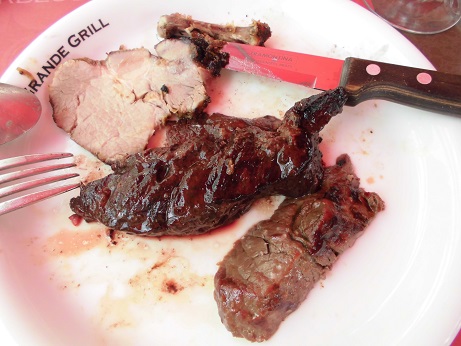 前から気になっていた肉のお店です。リオグランデグリル 横浜ベイクォーターランチのシュラスココース(1人3,888円)を注文。これにアルコール飲み放題(1人2,000円)を追加。肉はスタッフの人が持ってきてくれるシュラスコを食べ放題。サラダバー、ソフトドリンク付き。座ったのがテラス席だったので、ちょっと肉が来るペースが遅かったのですが、結局は十分過ぎるくらい食べました。味はまあまあ。私の歳になると食べ放題でも元を取れるほどではないので、別のお店の方が良いかという感じ。息子が食べ盛りになったら来たがるかも知れませんが。シュラスコ道具シリーズ トラモンティーナ カービングセット 22299/012