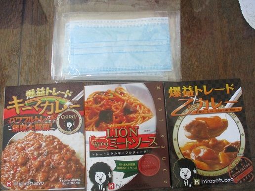 Lion FXのぞろ目と10万通貨取引でもらったものです。カレー2箱とパスタソース今回もマスク(今回は5枚!)が同封されていました。我が家は特定警戒都道府県なのに、アベノマスクは未着(欲しくもないですが)。手に入るようになったとは言え、まだまだ高価なマスク。これで企業イメージは良くなったでしょうし、宣伝効果も考えれば間違いなく元は取れるでしょう。関西の企業は、こういうところのお金の使い方がうまいところが多いようです。安倍政権も火事場泥棒に勤しんでばかりいないで、ヒロセ通商の爪の垢でも煎じて飲んだら良いのではと思います。