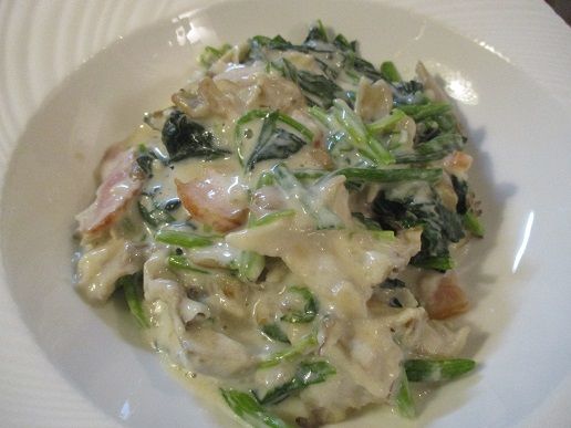 ベーコンとほうれん草、キノコのホワイトソース