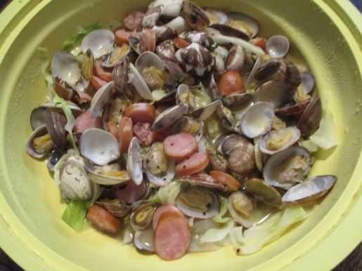 キャベツとアサリ、ベーコンの白ワイン蒸し