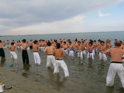 今年初めての空手の稽古の日。師範にお願いしました。「明日の寒稽古自信ないから、走る練習してもいいですか?」走るのはやっぱり普段から走らないと自信がありません。。。。折り返し地点までに、かなり遅く走っていた去年。今年はそんなことにならぬようにちょっと前から少しずつ走っていた私です。今年になっての初めての稽古久しぶりだとやっぱりしんどいわ。 年とともに不安になるものよ、と思いながら翌日寒稽古に参加した私です。ちょっとしたジョギング程度のものなんだけど砂浜は、しんどいです。でも走った後の爽快感は気持ちいいです。 形の練習や移動の基本・・・そして、 かっこいいでしょ私たちは、こんな感じです。 これは入る前の私たち。。。水の中に入るのは、はじめは冷たいけれど慣れてくるとそんなに辛いものではないですよ。そして、終わってから師範と会長に挨拶して帰るんですが師範から「会長に、『今年は黒帯~』って云え!」 そんなこと・・・・・・言ってしまいました。頑張らなきゃ