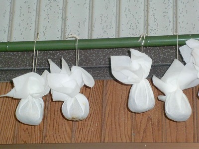 一ヶ月ほど前、友人からもらいました。『一ヶ月ぐらい干しておいてから、うす~く切ってたべてみ。おいしいで。。』もらったのはこれ。 てるてる坊主じゃありません。でも逆さまだから、お天気には効かないかも。。『ゆべし』というそうです。ゆずに味噌がつめてあるそうです。初めて聞く食べ物です。まだ食べていません。開けるのが怖いんです。・・・・・・・・・・・・・・・・・・・・・美味しいんでしょうか明日食べてみます。