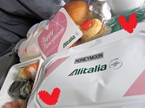 帰って来ました~旅行に行っていました新婚旅行でイタリアにJTBさんのツアー「イタリア満喫ミラノから人気の4都市めぐり8」に参加! 新婚さん・お友達同士・人生の先輩のご夫婦などいろいろな方が参加されておりましたヨーロッパは初めてで、楽しみな半分、飛行機が12時間とドキドキ・・・成田空港を無事離陸して飛行機が安定したころ機内食が出てきました それが、ビックリすることがありましたーーなんと、メニューが一般のお客さんと違っていたのですどのお客さんよりも先に配ってくださり、「Happy Honeymoon」と書いたカード&特別なメニュー&ケーキを配ってくれました ALitalia航空のちょっとした御もてなしに大感激です旦那共々、テンションがあがりました♪「どうして私たちが新婚ってわかるんだろう~?」と疑問はありますが添乗員さんがきっと手配してくれたんでしょう~ 12時間、映画を見たり、本を読んだりゲームをしたり、寝たり~2回目の簡単な食事を食べたりとなんとか過ごすことができました。最後の着陸の時、少し酔ってしまった私ですが、なんとかイタリヤに天気は晴れイタリアの現地時間18時にミラノのマルペンサ空港に到着!バスでホテルへ日本とイタリアの時差は7時間イタリアは夜9時頃まで明るいためビックリでした☆これからどんどんイタリア旅行をupしていきます