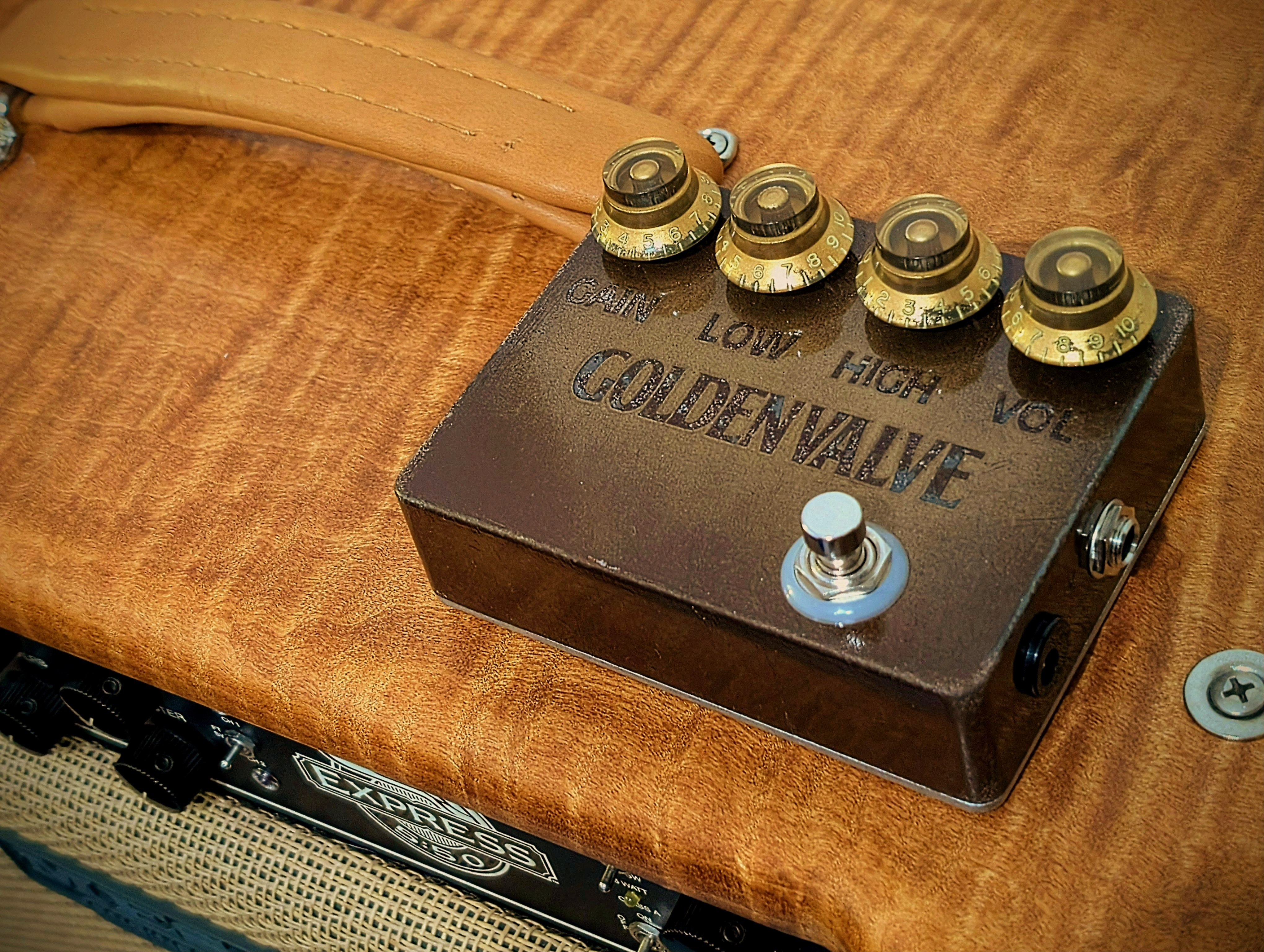 YouTubeではお馴染み “ギター屋 funk ojisan” のハンドメイドエフェクター “GOLDEN VALVE” を手に入れました。ビルダーの河田健太氏はアンプビルダーの重鎮、Akima & Neos Lab 代表 秋間 経夫氏の唯一の弟子でもあるようです。YouTube企画では様々な有名機材を実演して忖度なしにレビューしたりと、少しマニアックな内容が多く興味深く拝見しています。 “GOLDEN VALVE” は何かのクローンというわけではなく、あくまで作り手が求める “格好良い音” を狙ったオリジナルペダル。ヴィンテージコンデンサ云々で売り出すのを嫌う価値観もあり、手に入るパーツの特性を活かして組み上げ真空管のリアルなドライブサウンドと反応スピード、ボリュームの追従性を狙ったペダルの様です。筐体はエイジングされたゴールドカラーにトップハットノブという Gibson Gold Top の貫禄。エイジング処理は作業者が複数人いるのか、かなり個体差があるようですが良い感じです(本当に錆びさせている?)手に入れた個体は中古でしたが前オーナーが買えたのかノブが立体エンボス文字でエイジングされている嬉しい仕様でした。※標準ではない?出音の傾向としては、一般的なオーバードライブではなく出力(アウトプット)を上げて歪ませた様な歪み方。粒のそろった綺麗なドライブサウンドというよりは真空管のボリュームを上げてドライブさせた粒が粗いワイルドな歪みです。ゲイン自体はそこまで高くありませんが出力量が高いので反応スピードが速くセンシティブに反応します。※上げ過ぎるとハウリングします。全体的に音が暖かくファットになりますが原音のニュアンスが残っていて高域の煌びやかさと分離感を感じました。1~3弦はクリアなまま太く、巻き弦の3~6弦も同様にクリアさを保っていますがコンプ感が増しジャキっとした煌びやかな部分も出てますが太く丸い。真空管アンプに近い出音の特徴を持っています。古いアンプと古いギターでドライブさせてロックしている様な、いなたさを持った無骨でロックなサウンド。ボリュームの追従性も良く、ハイパスコンデンサの様にボリュームを下げても高域が残るので非常に使い勝手がよろしい!YAMAHA THR30(トランジスタ アンプ)でも試してみましたが、真空管っぽさが増して相性も良いです。万能で良いですね。 見た目も音も良いです。この価格にしてこの音が手に入るのであればコスパは高いと思います。満足度高めです。※以下、本家コピペ回路には真空管に一番動作が近いとされている増幅素子FETを使い、プッシュプル回路でダイナミックにゲインを稼いでいます。配線材にはヴィンテージアンプと同じ錫メッキの単線を使いきらびやかな高音とストレートなサウンドを意識しています。昔ながらのラグ板を使ったパーツトゥパーツで回路を組み、サウンドの肝となるコンデンサーには電解コンデンサは用いず、セラミックのアタック感のある硬質なサウンドとフィルムのミッドの艶を混ぜることでこのサウンドを作りこんでいます。■追記作動電圧が18Vまで対応ということで、XOTIC XVD-1(15V or 18V昇圧)を使って試してみました。結論、めちゃくちゃ良いです。分離感が更に良くなってミドルがグッと出てハリが出ました。15Vも試しましたがコイツは18Vで本領発揮な気がします!当初の9V作動では巻き弦(5~6弦)が少し飽和し過ぎる印象も受けましたが、18Vでは更にタッチの明瞭さが上がりニュアンスが出しやすくなりました。気になっていたホワイトノイズが電圧を上げることで減ったのも嬉しい誤算でした。