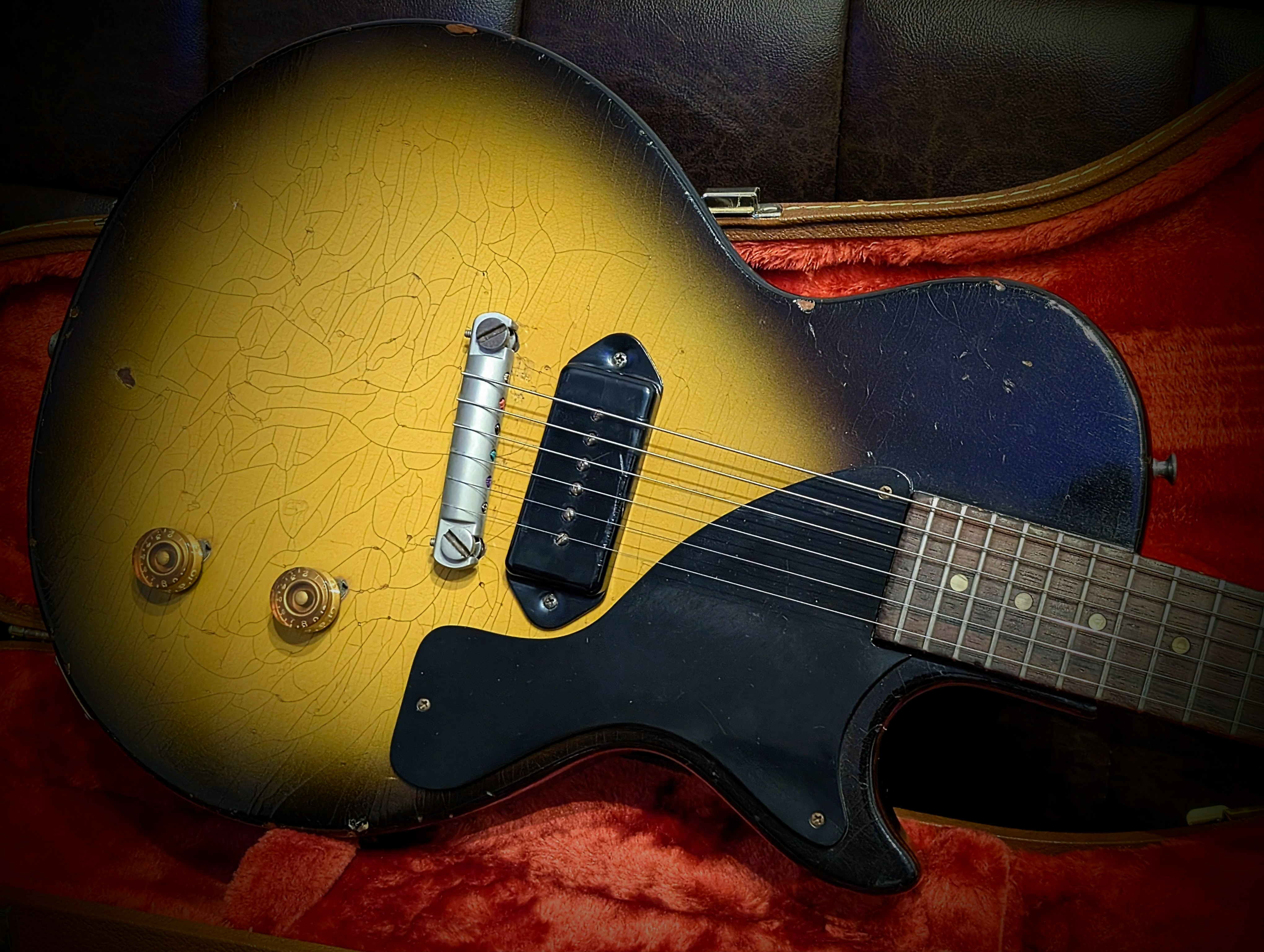 そんなこんなで手に入れたのはコチラ。■Gibson 1956 Les Paul Juniorついに、リアルヴィンテージに手を出してしまいました。勿論、新しいGibsonがNGという考えは毛頭ないんですが下取りの2本を手放して1本にするとなれば、2本合わせたものより所有欲を充たせるものを手に入れたかったということと、元々ジュニアが欲しかったということがあります。将来的にって言ってもヴィンテージは値段が上がっていきますし数自体が無い。これ以上高騰する前にGETしときました。ということで、自己満足の強めのレビューです。手始めに見た目。エイジング仕上げが流行っている現在ですが、本器で確認できる複雑怪奇なクラックの数々は大胆でありながらも顕微鏡レベルに細かく、全体にビッシリと広がっています。ラッカー塗装の退色具合に関しても経年によってサンバーストの赤みは消え、タバコサンバーストになるかと思いきやブラックカラーすらも薄くなり、緑がかった様な独特な色味です。よくよく見ると所々に散った赤めの塗料が確認できるという非常な複雑な色味になっています。こういった自然に発生した経年具合や存在感は、現行のカスタムショップ製品を見ても差があり、塗装技術云々では表現できない部類。もはや自然が織りなすアートのレベルです。この情報量だけでもヨダレが出ますね。マテリアルとしてこの時代は当たり前の様にワンピースのホンジュラスマホガニーボディ&ネック、ハカランダ指板が採用されています。ジュニアはスチューデントモデルとして生まれ、一般的なアーチトップのレスポール(スタンダード:STD)に採用されるメイプルトップ&マホガニーバックに対し、STD用に切り出したマホガニーバック(ワンピース)のみを採用したモデル。とは言え、使用されるバック材はSTDと同じなので贅沢なホンジュラスマホガニーが採用されています。 経験上、綺麗な柾目はレスポンスが良く整った響きで、うねりが多い方とミドルが豊かで粘りがあり複雑な響きに感じます。個人的には見た目も音も若干うねっていた方が味があって好きです。当時のギブソンは現在でいう “USA” “CustomShop” の様に木材や部品のグレードを落したり、製造国や部署を変えて人件費を抑えるといった考え方はまだ無く『工程数は抑えるが仕様におけるクオリティは他モデルと同様』ということで、あくまで熟練した職人の手作業による作りになっています。今ではボディを自動で切り出したりと出来る時代ですが、当時にそんなものは無く、あくまで人の手で切り出し削られ組付けられた完全ハンドメイド。自動化の現在でそこまで行える職人はほぼ存在しないに等しいでしょう。それ故にスチューデントモデルでも精度に妥協はありません。製品上、コストカットされた部分も多々見受けられます。例えばジュニアのヘッドは突板が無く、代わりにブラックの塗装で塗りつぶされ、金色のシルクスクリーンで仕上げられています。また、ネックのインレイもドットに変更され、サイドバインディングも省略されて手間を省いています。ペグも3つずつ連結・簡素化されて、見た目にも小ぶりで可愛いですね。ネックジョイントに関しては手間のかかる “ディープジョイント” ではなく差し込み型の “ボックスジョイント” によってボディとネックをニカワ接着。強度を考えて残した接合部の段差(カッタウェイ部分)がそれを物語ります。こういった造形やコストカット部分も『当時の職人が色々考えたんだろうなぁ』なんて歴史を感じてニヤニヤしてしまうわけです。ピックアップは50年代特有のロングマグネットを採用したP-90 通称 “ドッグイヤー” をダイレクトマウントで一発。コントロールは ボリューム&トーン 1つずつなのでボディ加工や配線処理もシンプルの極み。ブリッジに関してもオクターブチューニングが出来ないロングスタッド(55年付近までショート)のバーブリッジ仕様です。こういった部品点数と装着に伴う作業量の簡略化によって費用を抑えているジュニアですが、結果的に加工されている部分が少なく、木材が多く使われ “ドッグイヤー” と “バーブリッジ” という仕様も相まって弦振動をダイレクトに拾って出力する特性となりました。その個性的なサウンドと共に伝説的なミュージシャンに認知・愛用され、確固たる地位を得たモデルになったわけです。そんなレスポールジュニアですが、実はシングルカッタウェイのモデルは1955~1957年までで僅か3年しか作られておりません。半世紀以上経った今でも “1957リイシューモデル”として再発売される実態を踏まえると如何に後世に影響を与えた存在かが伺えます。その長い歳月を考えれば世界各国を渡り歩き、過去オーナーの熱い想いが詰まった遺品となっている可能性も高く、しかるべき運命の中で継承され、こうして自分の手元に存在していると思うと謎のロマンを感じずにはいれません。
