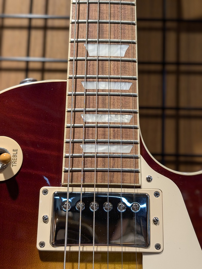 レスポールジュニア(1956年)の指板。約70年という、捉え方によっては人の生涯を全うする時の経過を経たハカランダ指板。先代たちが使い込んできたからこその指板の消耗や指の摩擦で出たであろうレザーの経年変化にも通ずる色艶。当時だからこその質の高い材は勿論、使い込むことでこそ得られるこの風格がエイジング加工とは違ったリアルな風格。この風格をモチーフに今のエイジング加工が演出されていることを考えると、本物を所有する喜びを感じる。ヴィンテージの魅力は、当時の職人が生み出したハンドメイドの技術の素晴らしさ、材の良さ、お金では手に入れられない時の経過による見た目や音の経年変化は大きな魅力の1つ。最高の材を最高の技術で組み上げ育った音は説得力があります。