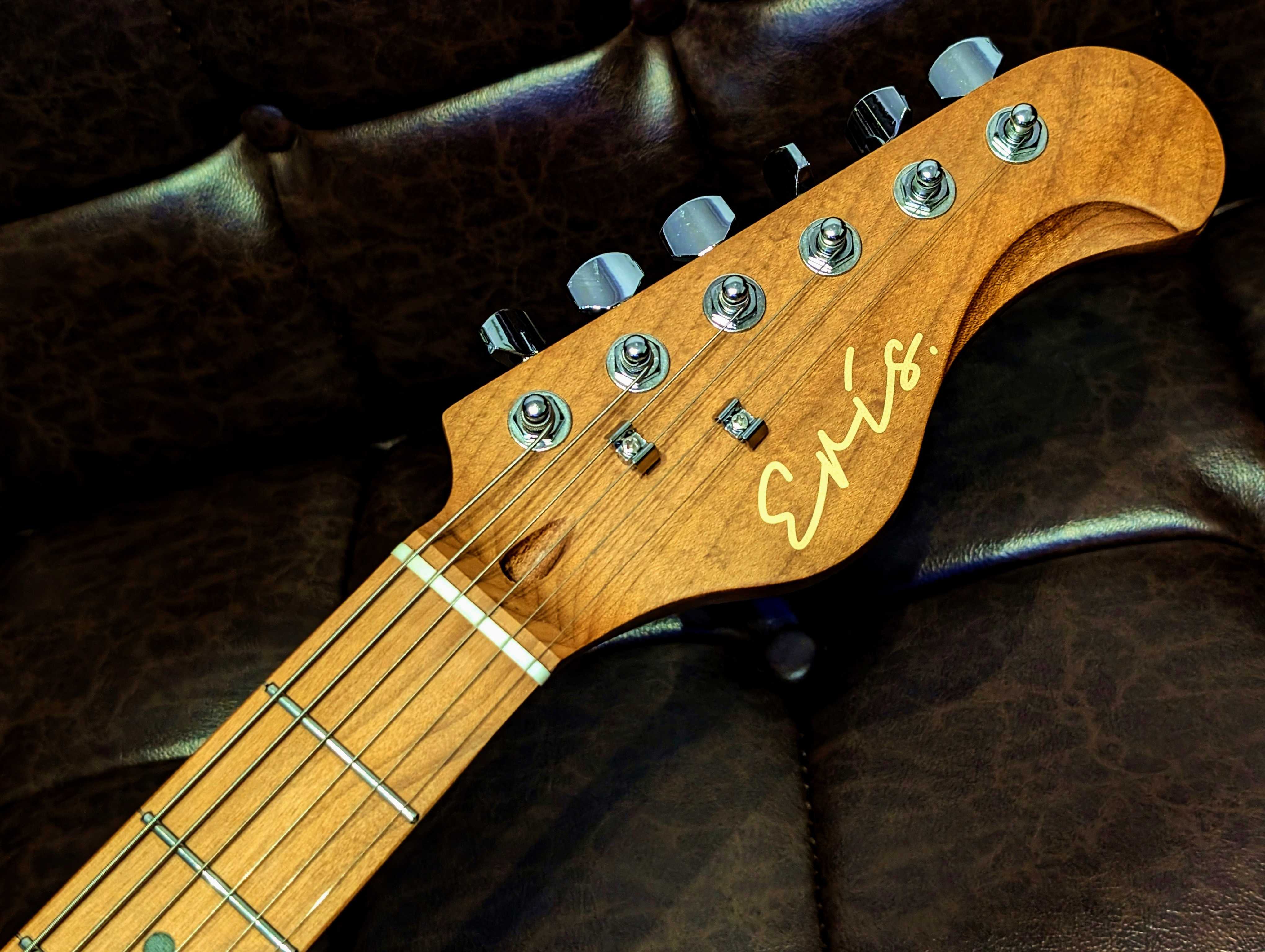娘が産まれたとき、自分の趣味のギターに興味を持ってほしいとミニギターを買ったりしていましたが、親の期待値とは裏腹に興味を示さず全て手放しました。7歳になって『私も弾きたい』と言うようになり、再び期待をして購入してみました。高いギターを買っても過去と同じ道を辿ると勿体ないので安価なモデルを探していたところ、島村楽器のオリジナルギターで通販専用モデル(限界までコストカットする為に通販ONLY)というのを知り、良さそうなので手に入れました。体の小さい子供の体格を考えれば、本来は適切なサイズのミニギターなのでしょうが、厳格な父(俺)はあえてレギュラーサイズを選択。手の小さな幼少期に標準サイズで慣れておけば指の可動域も広がるでしょうし、逆に上手くなるだろうという思考です。手元に届いたギターを見た感想としては、想像以上にしっかり作られていてビックリ。見た目もオシャレでパっと見てこれが1万円台半ば(新品)で購入できるモデルだとは思えません。指板はローステッドメイプル or テックウッド(人工合板)を選択出来ますがローステッドメイプルを選択。ネックは635mmとロングとミディアムの中間(PRS)スケール。ナットは硬質ファイバーナットでフレットもエッジを丸く処理されています。フレットはエッジ処理した後に打ち込んでいるので幅が絶妙に短いのですが見た目も好印象で弾きやすく、ナットやブリッジ、トラスロッド等、出荷時の調整もある程度は施されていて企業努力を感じました。ローステッド(燻製)のネック&指板に関しては木材の枯渇問題や強度不足対策で剛性を増す為に生まれた近年良く見る仕様。個人的にメイプルの白い色味よりもローストした色味の方がヴィンテージっぽいと言うか高級感があって格好良く見えるのでお気に入りです。リニューアルされた新形状のヘッドもひと手間あって格好良い。嬉しいことに、手に入れた個体のネックは柾目で輝くトラ杢が確認できます。通販専用モデルでこの杢を持つネックを手に入れられたので得をした気分です。生産は中国の様で少し先入観がありますがつくりは良いですね。軽量なポプラ材を使用したボディとローストされて乾いたネック、クセの無いピックアップによる出音はナチュラルで素直な響き。こもりが無く明瞭なストラトさがしっかりあります。過去、島村楽器オリジナルの“COOLZ”に装着していたピックアップよりも低価格帯のコチラのピックアップの方が出来が良い印象。自分が若かりし頃に手にした“バンドやろうぜ” 掲載の同価格帯とは比べ物にならない仕上がりなので時代は進化したなと感じました。しかもコイルタップまで付いていて万能。更には厚手のギグバッグもついてきます(昔は保護材が無いナイロンケースだったのに・・・)とまぁ。良い部分だけ述べてきましたが、厳しい目線でマイナスポイントも記しておきます。そこまで求めてはいけないのですが、しいて言えばペグとトレモロの遊びが少し大きいなと感じたくらい。見る人が見れば致し方ない部分も在りますが、それが十万円を超えるギターならまだしも新品で1万円台(15,800円)という圧倒的なコストパフォーマンスの前では文句を言う方が虚しく、仕上がりにはむしろ感心するばかり。2台巨頭でもある某USAブランド等と比べても逆に仕上がりが良いのでは。さらに “親の気持ち、娘知らず” で密かに施した“Raw Vintage”のトレモロスプリング交換が功を奏して非常に良い音に変わりました。このスプリングはその昔、自分がストラトタイプを愛用していて効果が期待出来たので自己満足ですが購入&プレゼントしました。チューニングが安定するのと、柔らかいスプリングでアーミングも滑らか、コイルの残響効果でナチュラルなリバーブ感と高域の柔らかさ、加えてレンジも広がります。※アース配線も長かったのでスムージング化。 効果は期待以上で明らかに響きが変わり、好みはありますが自分としては良い方向性(ヴィンテージライク)にもっていけました。そのうち内部の配線(まだ見ていない)をヴィンテージはんだで再装着して綺麗にしようかなと(笑)自分のアンプを勝手に使われたくないので “Orange Crush MINI(AMP)” と “SOUND HOUSE ORIGINAL(シールド)” も購入。安価なモデルの中で良さげなものを買ってみたわけですが、アンプはヴィンテージ感がある素敵なトーンで想像以上。有名どころの “YAMAHA THR” のフルレンジスピーカーとは違い、本来のアンプの音が楽しめる。守備範囲がそこそこ広く、木製キャビネットなのでミニサイズながら結構良い鳴りしてます。ギターもそうですが、お値段以上に良いものって多いなと気付かされました。衰退していく楽器業界ですが、昭和の残党(私)としては、また流行って欲しいなと切に願います。■島村楽器WEBSHOP限定モデル Eris. Nestia ボディ:ポプラ ネック:ローステッドメイプル 指板:ローステッドメイプル(ブラックカラーのみテックウッド) ナット幅:41mm スケ
