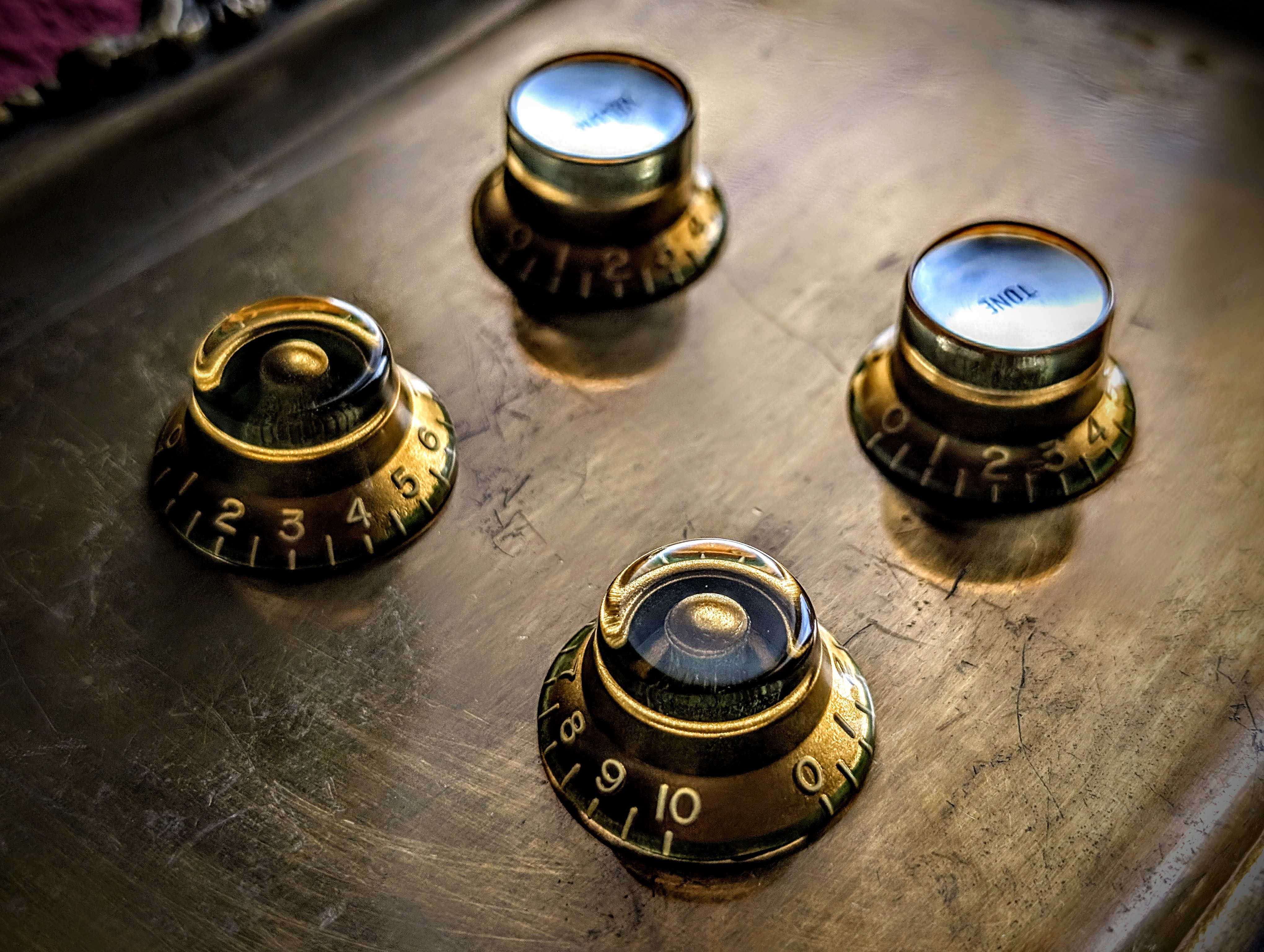 そこまでこだわる意味があるのか・・・かつてはそう思っていましたが、ついに自分もその領域まで突入しました。ヴィンテージギターというのは、流れる年月の中で新品の部品が時の経過(経年)と共に日焼けで黄ばんだり、経年変化で収縮したり。。その経年による収縮/変形、使用によるダメージが芸術作品の様にマニアを唸らせているわけですが…そんな濃い世界を理解しつつあるのが今の自分。■ボリューム&トーンノブの話。ヴィンテージレプリカパーツは数あれど、目が肥えた者が見れば少し曖昧な仕上げで “あと少し” という惜しい部分が多くあります。雰囲気は良く出ているのに成型がなぁ…なんて思って自分のギターを眺め、精度の良いものに変えようかと衝動に駆られていたんですが、なにせヴィンテージレプリカ品とは言え値段が高い! それであれば…自分でやれなくもないよな…と思い立ちまして、やっちゃいました。写真は作業完了後。既に装着されていたヴィンテージレプリカ品ではありましたが、経年による変形具合が甘い!!例えばトップハットの上部センターの “えくぼ” と呼ばれる収縮の演出や使用による削れ具合など、リアリティが出てくれば格好良くなる。 ならば “削って調整してしまえば良い” と思い、全体的な歪みや日焼けによる色味など、手元にある材料で挑戦してみました。・・・結果として最初よりは明らかに良い感じに仕上がりました。自分でやったので出費も抑えられますし、下手なレプリカよりもオンリーワンで格好良いのでは!勿論、こんなところを変えてもサウンドに影響はありませんが(汗)