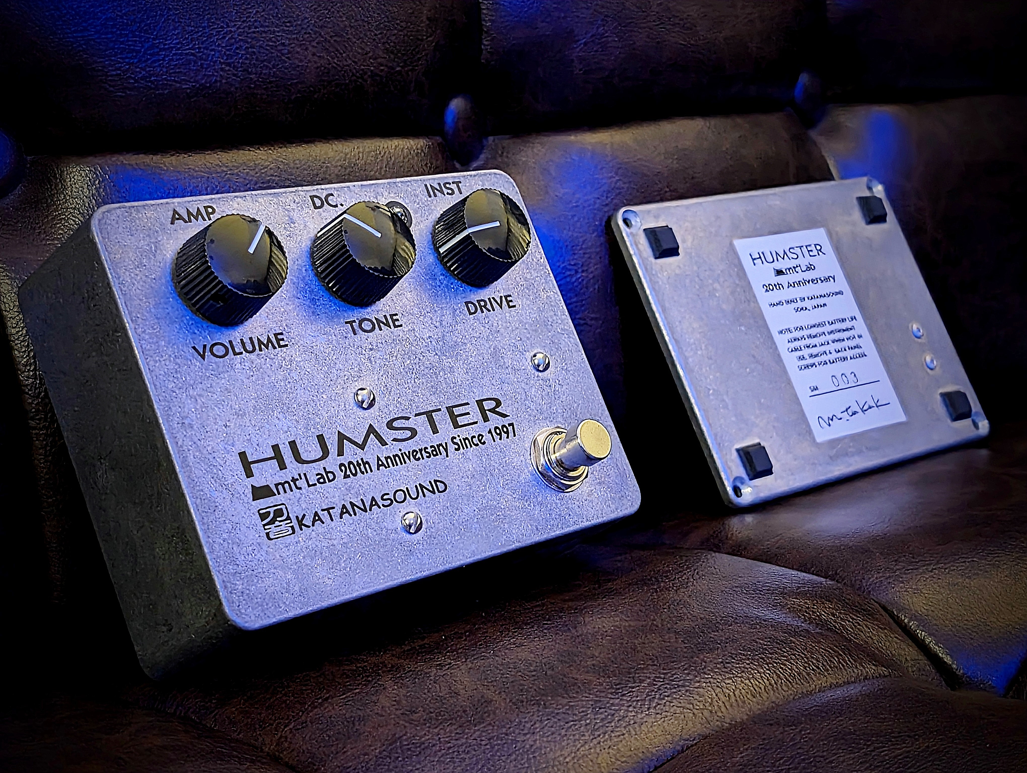 “KATANASOUND EFFECT PEDALS” は2003年に米国での販売をキッカケに立ち上げ、製作者である高木氏がパーツ選定からハンダ、組み込みに至るすべての工程を1人で手掛ける至高のブランド。 “HUMSTER 20th Anniv. ” はmt'Lab時代に手掛けた名器HUMSTERの最終進化版と言われる “HUMSTER Ultimate” の回路を基礎に、プリント基板やタグボードを一切使わず、完全なポイント・トゥ・ポイント配線で組み上げてチューニングした至高の逸品。オペアンプの取り付けもプリント基板を排除するため、真空管で使用するMT9 ピンソケットに適合するアダプターを自作し、カップリングコンデンサにはツイードアンプのリプレイスメントコンデンサとして定評のある “Jupiter Condenser Red Astron” を使用する等、かなり強いコダワリを持った受注生産20周年記念モデルです。残念ながら “KATANASOUND EFFECT PEDALS” は部品供給問題によって2021年、18年の歴史に幕を閉じてしまいました。少しクセの強いデザインで好き嫌いは分かれるのかもしれませんが、音に関しては何処かしらヴィンテージらしさを感じながら現代音楽においての扱い易さを兼ね備えた数少ないブランドでしたので残念です。個人的に所有しているのは “SOUL BABY(ワウペダル)” と “HUMSTER(オーバードライブ)”というKATANAブランドの中では比較的メジャーな2つ。とは言え、流通量が少ないので意外と希少かもです。相変わらずと言ったら何ですが、ポイント・トゥ・ポイント配線に徹底的にこだわった内部配線が独創的で美しいです。その音も中々他では出せない個性を持っている様に感じます。 “HUMSTER” に関してはギター/ベース共にブースターとして定評がありますが、ギターで使用した場合にシングルコイルをハムバッカーの様にファットにする特性を持っています。※開発コンセプトらしい。試した結果、出力の弱いピックアップであればハムバッカーでも合いますね。内部パーツにジュピターコンデンサーを使っている影響なのか、ギターのトーンを絞った時の様な暖かさを感じ、そこから音色を調節して分厚くブーストした様な感じ。どこかツイードアンプやケンタウルスの様な雰囲気も感じる絶妙なチューニングです。 特に単音弾きやチョーキング時に粘りがあって伸びるというか・・・歯切れは良いんですがあっさりはしていない。あまり歪みませんが音は太く味は濃い。太麺です!何かを模した王道タイプでは出せない特徴的な音なので、好きな人にはハマるかなと。軽いクランチ程度でも太く奥深い響きなのでブルース系を好む人なんかはニュアンスを出すのにも重宝しそうです。
