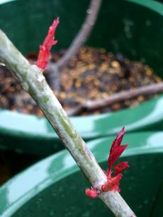 これは、Cafeの赤い棘。今日は朝からしとしと。ひと雨ごとに、春が近づいてきてますね。薔薇もだいぶ、芽吹いてきました。遅くて心配した、Magenta、Bluemoon、Clementina carbonieri(美人どころばかり。。)もやっと芽吹きが始まり、生存が確認できて(笑)ほーっとしてます。 Mlle franziska kruger。ティーローズの新芽は、赤い赤いものが多くないですか。ごつごつした、骨っぽい枝ぶりとは対照的です。春眠暁を覚えず、最近は家族みんな出かけたあとも、まだ毛布でうだうだしてる レオ二ダス。先日、横浜のフリマをのぞいて買った、スペインのガーリックポット、にんにく保存瓶ね。以前から欲しかったんですが、やっと気に入った色のに出会えました。ちょっと、キッチンにも春の花柄を。。うち、にんにくの消費、けっこう多いんですのー。オホホ。(@@) お餅は、どうお食べになりますか。最近はまってるのが、黒砂糖、バター、醤油をフライパンで混ぜ溶かし、そこに、焼いたもちを入れてよーくからめ、出来上がりに、黒ゴマをすったものを、どさっとまぶしかける、というレシピ。よくおじゃましてる園芸サイト(楽天外)に載ってたんですが、ハマリまして、三月になっても、お餅を買ってきて食べてます。(笑)レオ二ダスさん、あーた、たぶんもう痩せない。そう言いたい?わかってますって。(^^;)