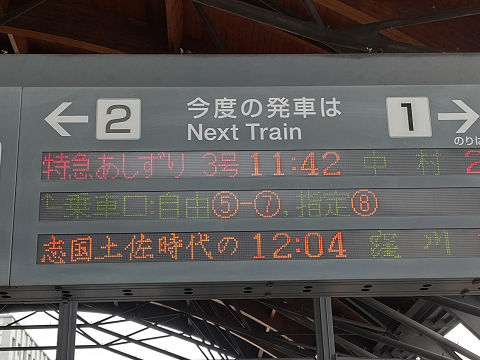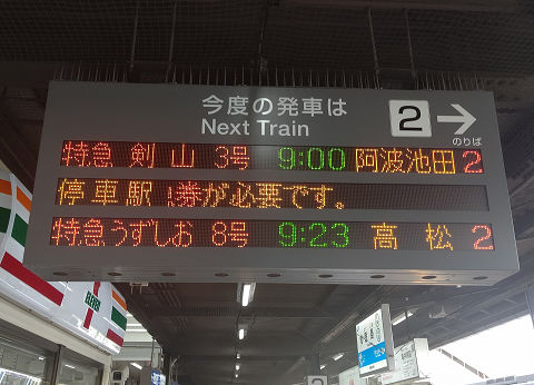 夜が白むJR児島駅。「乗り鉄の朝は早い」。 こんなフレーズを使うのは843日ぶり。無限ではない人生、そろりと”鉄活”再開。 しかしながら、いつも、実行段階になって、こんな朝早い行程にしたことを後悔する。 ファジアーノの中国リーグ時代の石見FCやセントラル中国とのアウェイ戦もキックオフ時間が午前11時とかで、夜更けにツアーバスに乗っていたことが思い出される。 JR四国の「バースデイきっぷ」。3日間特急列車乗り放題で9,680円だけど、。今回は、グリーン車も乗れる13,240円のやつにしました。 ただただ、列車に乗っているだけの、無駄で楽しい旅のスタートは、JR西日本とJR四国との境界駅の児島駅からスタート。 残念ながら、高松行きのマリンライナー1号は2両編成で、グリーン車は連結されていない。そもそも、指定席もないから、きっぷの威力は発揮されない。 高松行きのマリンライナーでは左側の車窓からは、瀬戸内海に昇る朝日が見え、右側の車窓からは高松駅に入る前に車両基地では、特急列車や「四国千年ものがたり」などの観光列車の姿が見える。 高松駅では、乗客をおろす前に連結作業があり、2両編成が7両編成となる。 そんなん、客を降ろしてから、やってくれと思う。 高松に来れば、朝は讃岐うどんからと思ったら、高松駅構内の「連絡船うどん」がなくなっている。 それならばと、駅前のうどんやへ向かったものの、営業中の黄色いパトランプが回転していない。讃岐うどんは、朝早くからやっている働き者かと思ったが、市街地の店はそうではないらしい。 うどんの本場の高松駅に立ち食いうどんがないのは意外だ。 高知まで向かうのに、遠回りして、徳島行きの特急うずしお3号に乗車。 2700系気動車の3両編成で、1両目の前7列が指定席。wi-fiも使えて快適だ。 ファジアーノの試合で徳島アウェイに車で行くと、車窓左側に陽光にキラキラと輝く瀬戸内海の風景が目に飛び込んでくるが、高徳線からは、ほとんど海は見えない。 讃岐津田駅を過ぎた辺りと讃岐相生駅付近だけ。 意外と線形もよく、うずしおは徳島に向けて最高時速120キロで快走する。 高松駅から70分。あっという間に徳島駅に到着。 ここまでのところは、全て既乗区間だ。 徳島駅は、高松、鳴門、阿波海南、阿波池田方面の四方向に向けて列車が出発する一大ターミナルだけど、自動改札機ではない。 ここでも、うどん屋は開店前。ここで、食料を調達しなければ、昼抜きになるかもしれない、あいかわらずのゆとりのない計画。駅構内のセブンイレブンで朝食調達。