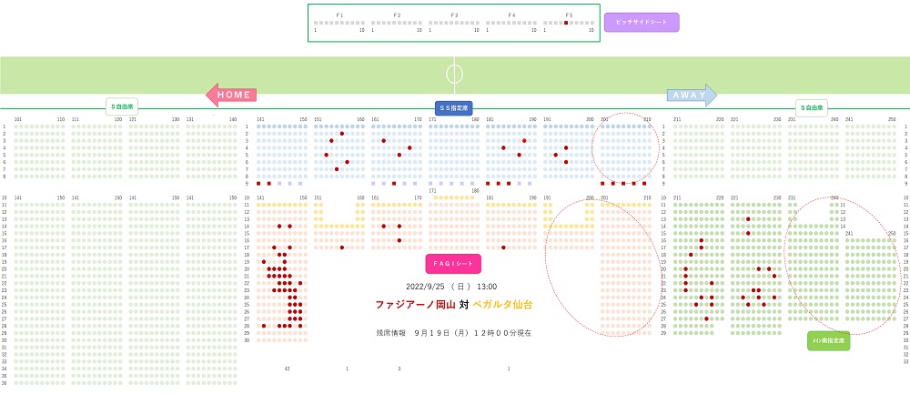 _仙台戦のチケットの販売状況が好調のようだ。 Jリーグのオフィシャルサイトによると、「シティライトスタジアム (入場可能数:15,479人) 」となっているけど、今は、ゴール裏が観戦エリアになっていないので、全席完売となったとしても、14,000人くらいになるのかな。【仙台戦チケット販売状況】9/19 12:00現在 △ ピッチサイド △ FAGIシート △ SS指定席 △ メイン南指定席 × S自由席 ○ メインA自由席 ○ バックA自由席 ○ ビジター自由席 指定席は連席から売れているようですね。画像の赤の点線で囲ったエリアは、今後、追加されるのかもしれない。 にほんブログ村