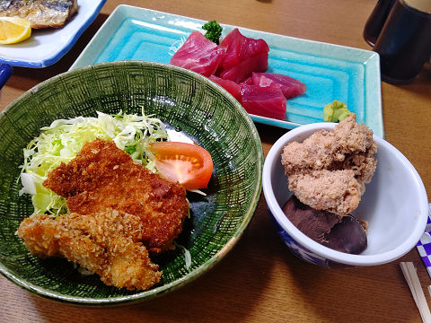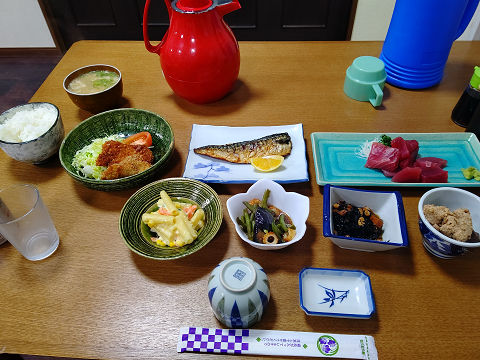 夕食は、刺し身、フライ、たまご、心臓などマグロがメイン。家庭風の料理で苦しいほどお腹いっぱい。鯖を食べられないことを、事前に伝えておけばよかったな。