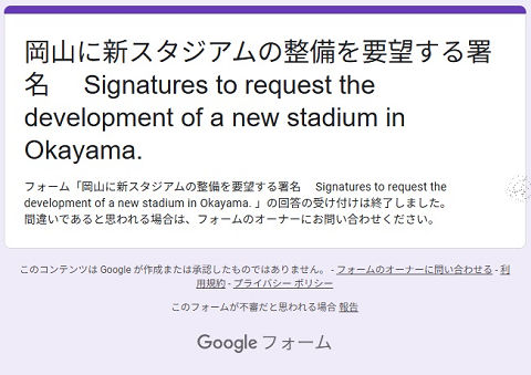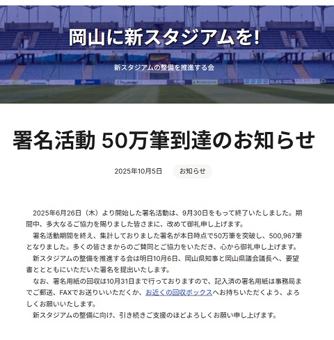 多少なりとも、署名活動に関わってきた身でも50万突破には驚いた。 しばらく、感慨にふけって、スマホの画面を見つめた。 9月29日時点での発表では、410,595筆だったので、45万行けばいいかなと思っていた。 同様の署名で、過去最多は、京都の新スタジアム建設推進の署名で、2010年11月~2011年6月の約7か月間での479,601筆。これを大きく上回る数字はインパクトのある数字だ! 10/5最終集計結果が出ました!50万筆を超えました!#岡山に新スタジアムを!署名活動(6月26日~9月30日) ----------------------------------9月30日最終 500,967筆----------------------------------https://t.co/uHXzcvt6yM pic.twitter.com/atLvDFjrIX— じゃす (@tama_jus) October 5, 2025 一筆一筆に署名を書いてくれた人、集めてくれて人たちの想いがこもっている。 署名できる期間がもう少しあれば、50万筆を超えたというニュースを見て、もっと多くの人が署名してくれてかもしれない。 署名活動は一定の成功を収めたと思っているが、だからといって、何かが約束されたわけではない。 伊原木知事のこれまでの発言は「無い袖は振れない」的なことでは、まったくないと思うので、明日の署名提出時の知事の言葉やマスコミの報道に注目だ。にほんブログ村