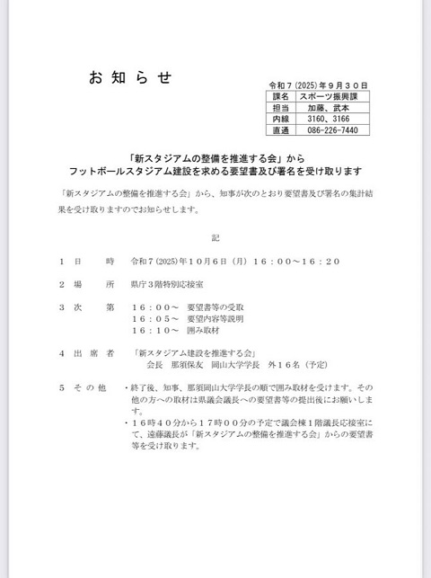 _何万筆を集めてくれた企業、署名用紙の束を持ち込んでくれたサポーターなど、署名活動を支えてくれた団体、個人の方々には感謝しかない。 38万筆という数字。みなさんの想いを込めた一筆一筆の積み重ねがここまでやってきたのだと思う。署名数の発表は、これまで土、日、月は休みだったので、次の発表は最終日の30日(火)なと思っていたのですが、昨日は発表がありました。前日比+10,558#岡山に新スタジアムを pic.twitter.com/kROorSMaWr— たーぼ (@hare_no_kuni) September 27, 2025 広島で実施された新スタジアム署名の370,579筆を上回った際に、広島と比較しても意味が無いというような意見もあったが、行政的には、他県の先例というのは大いに意識し、基準となる数字。 広島県の人口は278万人で、187万人の岡山県の1.5倍の大きな県。そこに並んだだけでも、意味があると思う。ただ、数字を評価するのは、あくまでも署名を受けとる側だ。 署名活動で応援がおろそかになっているのではという批判が一部にあるが、みんな、仕事、育児、介護、勉強などに全力で頑張りながら応援していて、署名活動で応援がおろそかになるなんてありえないと思う。 勝ち点が40 署名数は38万 どちらも、最後の最後まで粘って、もっともっと伸ばしたい。 泣いても笑ってもラスト3日、やりきりましょう。にほんブログ村