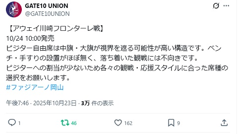 _セレッソ大阪戦の本日のファンクラブ先行販売で、ホーム側は18試合連続完売、とりわけ、指定席は瞬殺だったようだ。 #ファジアーノ岡山今季開幕から18試合連続ホーム側完売!セレッソ大阪戦も先行販売で瞬殺でした全試合完売までいよいよあと1試合!#残るは浦和レッズ#岡山に新スタジアムを pic.twitter.com/imWFJhI2NQ— じゃす (@tama_jus) September 25, 2025 残りのホームゲームは、浦和戦のみ。これで、ホーム側全試合完売は当確。 指定席では、SB指定席以外はシーパス保有分がある上に、ファンクラブ先行発売の3日前に、スポンサーの招待分の申し込みがある(MAX1,159席、一部追加料金必要)ので、ファンクラブ会員でも指定席の確保は簡単なことではない。特にメインスタンドは、熾烈な争奪戦になるだろう。 セレッソ大阪戦の明日の一般発売分は、このくらいじゃないかな?(非公式) メインミックス指定 570 ビジター自由(バック)1,146 ビジター指定(バック)389 or 549 これまで、一部の対戦カードを除けば、メインミックス指定席は、ビジターサポが争奪戦を制覇している。 シーパスを非保有のファンクラブ会員は、先行入場不可なので、通常開門時間に入場すると、ホーム応援エリアの券でメイン側の席の確保は実質的に不可能。一人くらいなら何とかなるかも。ホームゴール裏になってしまう確率が高くなってしまうのは、気の毒だ。にほんブログ村