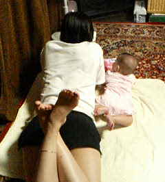 この間雨ですごかった日、家のリビングでリリーと寝っ転がって漫画を読んでたの!リリーと一緒にお風呂も入って、リラックスタイムで・・・・あ。ちなみに読んでいた漫画はNANA!あたし漫画が大好きで、家には軽く1000冊はある!(笑)友達には漫画喫茶とよく言われたよ(;^_^ANANAもその中で継続して買ってる漫画で、ついに13巻が出たから必死に読んでたの!そしたら・・・・・・・・・・・隣でもぞもぞ動いてたリリーが、寝返りしつつあたしの横まで来て「何読んでるのママ????」って感じであたしが読んでる漫画を覗いて来た!そんなうちらの姿を見た、あたしの伯母さんが「何かあんた達同じ格好してるよ!!」と言って来た。はぁ???って感じでリリーを見ると、確かにあたしと同じ様に後ろで足を組んでる!(笑)↓ あまりにも面白くて写メで撮りました(笑)何か遺伝子って怖い~!(^^;)リリーはちゃんと組めてないけど、足一緒じゃない?!(爆)最近リリーって色々な反応するから面白いんだよねー!お腹とか、脇とか、首筋をぱくぱく食べるフリをしたりチューしたりすると、くすぐったいみたいで、ケラケラ笑うの!声出して笑う様になったのはタイから帰って来てからなんだよー♪何でも口に入れちゃうのも始まってぞうさんのぬいぐるみの鼻も食べちゃうし、普段はスタイをさせてるんだケドスタイも食べちゃうし、タオルあげるとがぶがぶ食べてる(笑)この間なんて、抱っこしながらあたしの真ん中にお座りさせて携帯で友達にメールをしてたら携帯のはじっこもがぶがぶ!!!気付くと既によだれだらけで充電する部分がよだれの泡・泡・泡!やべぇーーー!壊れる!とか思ってすぐに拭いてティッシュでこよりなんかまで作って掃除したら何とか大丈夫だった;でもそんな反応がどれもかわいい・・・・・すいません親馬鹿です;前はただ寝てるだけだったカラ、こっちが何かして反応が返って来ると嬉しくって;良く寝るし、良く笑うし、元気いっぱいです!!!ちょっとした人見知りも始まって、長時間見慣れない人ばかりの顔を見てると泣き出しちゃうんだよー!きのうはお盆で親戚が集まっていたからぐずりまくってた(笑)ま、これもまた成長だよね~~~これからも楽しみだ!
