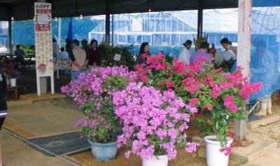 宮古島に移住して≪続.生産物即売≫前回に続いて、宮古総合実業高校での「教育フェアー~生産物即売・学習発表会~」を紹介します。前回、大根・キャベツ・バナナなど、野菜や果物の即売状況を紹介しましたが、他にもいろいろと販売していました。大根販売テントの横ではブーゲンビリアを売っていました。これも、次々と売れていきます。キャベツ畑を通り過ぎていくと、菊の鉢植えがハウスの中で売られています。その近くでは菊が展示されていて、足を止めて見入る人が多くいました。更に先へ行くと、鶏がいたり、山羊とあそべたり、馬をさわれたり、いろいろあって、親子連れが楽しんでいました。グルッと廻って入り口側近くに戻ると、クッキー・鶏肉・卵などの販売コーナーがあったんですが、長蛇の列でとても買えません。卵はすでに売り切れていて、13時以降に販売再開という生徒さんの説明でした。地道な勉強の成果を地域に提供する事で、地域から親しまれている学校の姿がここにありました。(今日これから大阪と名古屋へ行って、6日に埼玉へ戻ります)