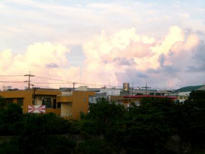 宮古島に移住して夕焼け雲まだまだ夏の暑さが続く宮古島です。朝の7時位までと、夕方の18時過ぎからは比較的過ごしやすい(直射日光が弱いため)です。が、たとえ曇っていても日中は暑いので上半身裸でいると、汗が体中から流れ落ちて、ビーチグラス製作にも支障をきたすほどです。そこで、日蔭の屋外を吹いてゆく風で汗を乾かすか、朝の10時頃又は夕方4時頃にシャワーor半水風呂を楽しんでいます。というか、そうでもして体を冷やさないと何もする気にならない、というのが本音です。ショッピングセンター・食堂・喫茶店・銀行などの店内に入ると冷房が効いていて、幸せな気分になれます。でも、自宅で何時間も冷房を効かせていると、体が慣れて涼しく感じなくなるし、体にもよくないので、シャワーor半水風呂が最高なんです。こうして過ごした日中も終わりが近くなる19時頃になると、空に浮かぶ雲が赤く染まり出します。 (ベランダから撮影)大きい入道雲が一列に連なって、左から右へゆっくりと移動しています。雲の中間から上は明るいピンク色に染まり、下(雲の底)の部分は灰色に見えます。いろんな角度から撮影しようと思って、自宅の周りを歩いてみましたら、少しづつ雲の色が濃くなっていきます。更に上空には、秋を思わせる刷毛ではいたような雲も見えますが、入道雲の存在が圧倒的です。目線を西の方向に移してみると、同じ様に雲が茜色に染まっていますが、そのはるか上には三日月が見えていました。丁度、昼と夜がせめぎ合う様子を見るようです。上写真の右下方向では夕立の雨が降っているような、雲の下がり方+雲の色です。自宅周辺を一周して戻ってくると、最初に見た入道雲の隊列が姿を消しています。雲は一層鮮やかな茜色を身にまとい、自慢げに聳え立っているように見えます。夕焼け雲は、一日の内で一番ドラマチックな瞬間である「入り日」の前触れを告げる存在なのかもしれません。