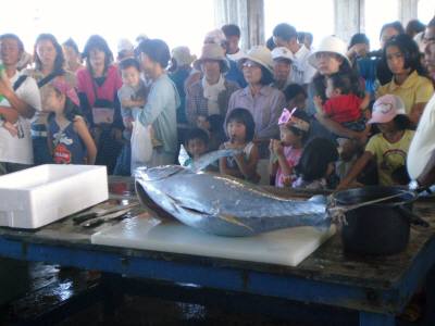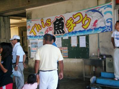 宮古島に移住してお魚祭り週末に、宮古島漁協で「お魚祭り」がありました。日本で初めて宮古島の沖合に“パヤオ(浮き漁礁)”ができて20数年。漁獲量が増加・安定したのを記念して「パヤオの日」を制定し、その日に市民や観光客を対象としたイベントを行うようになったんです。台風8号の影響で1週間延期になりましたが、15日に伊良部漁港で記念式典など、16日に宮古島漁港で各種イベントが執り行われました。午前中の早いうちから漁港に行ったんですが、モズクのつかみどり、主催者あいさつ、学生の演奏、園児のお遊戯、子供たちのお魚の絵コンテスト表彰などは、すでに終わっていました。しかし、会場(漁協1階で、いつもは朝7時半から行われる“競り市場”)はたくさんの人でごった返しています。朝に水揚げされた魚の競り風景を何度も見に来ていますが、こんなに多くの人が集まっているのは初めてです。おしゃれな帽子をかぶりハイヒールを履いているという事は、観光に来た人たちですね。年に一度の機会に巡り合えて、ラッキーですよー!会場内では、お母さん方が魚やモズクの天ぷら・ドーナツなどを作っています。作るのが追いつかないほどの売れ行きでしたが、私も天ぷらゲット!!特にモズクの天ぷらは最高でした。他にも、おソバやカツオの刺身など、いろんな物が売られています。しかも、その場で作り立てばかり!別の一角では、海の生き物たちが、説明付きで展示されています。子どもたちは興味深々で、手でなでたりつかんだり・・・。でも、大人も結構乗り出して見ていました。下の四角い板(黄緑っぽい)には、シャコ貝の赤ちゃんが固定されていて、資源保護の様子が分かるようになっています。 明日は、カツオ・マグロの解体です。楽しみにしていてください。