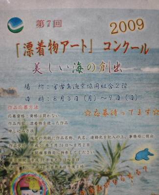 宮古島に移住して漂着物アートコンクール8月1日のブログでも触れましたが、8月3日から今日9日まで「第7回漂着物アートコンクール2009」が、海洋調査研究会の主催で開催されていました。この団体は、宮古島の各所に打ち上げられている漂着物の種類と量を調査するとともにその撤去に取り組んでいます。多くのボランティアや企業などの協力を得ての事です。漂着物の撤去と美しい自然の保全のためのベースとして、より多くの人に興味を持ってもらい、より楽しく取り組める企画として始めたコンクールです。今年も69組の作品が出展されました。作品は実にバラエティーに富んでいて、かつ最高齢69歳から修学前の子供まで出展者の年齢も幅広いのが特徴です。残念な事に台風8号の襲来で、来場者は例年より少なかったのではないかと思いますが、それでも300人以上に達し、180人以上が審査投票をしたという報告がありました。会場は自宅から近い荷川取漁港にある宮古島漁業協同組合の2階会議室です。今日の午後3時から表彰式があったので、私も顔を出しました。受賞作品の前には、既に各賞の名前が表示されています。今年の大賞は「夜光貝」という作品(たくさんの作品で1組)です。大きな壺状の形をしたランプシェード+様々に加工された夜光貝、一式です。加工が見事なだけでなく、貝を切断してできた形と曲線の美しさは秀逸でした。準大賞は2点で、「大物賞」と、 (一際大きい作品で、いかにも力作という感じ)「ゆかいな仲間たち」です。 (貝を上手に使い、楽しい雰囲気が出ている)優秀賞も2点で、「海からきたまんげきょう」と、 (蛇腹状のビニールパイプを万華鏡の 筒に見立てた発想の柔らかさが際立つ)「海からの贈り物」です。 (珊瑚を球状 にし、どこか和風の雰囲気)更に入賞作として、「枯れ木に花」という作品が宮古島市長賞を受賞しました。 (流木と貝の組み合わせが秀逸です) (作者は上品な年配のご婦人でした) 他にも入賞作品・入選作品がありますが、明日のブログで紹介したいと思います。