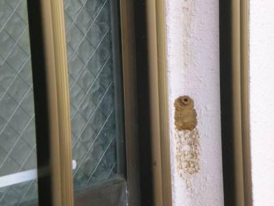 宮古島に移住して蜂の巣造り先日、家から出かけようとしている時に気づいたんですが、台所の窓近くの外壁に、蜂が巣を作っていました。材料は土の様な物で、一見して小さな徳利のように見えます。特に入口の部分は、丁寧に丸く作られています。実は去年も今回のすぐ下の場所に巣を作っていたので、慌ててつぶしたんです。というのも、長さ的に2cm以上もある大型の蜂ですし、刺されたりしたら大変と思って・・・・・。しかし、スズメバチのように大群じゃなくて一匹だけですし、あまりにも一生懸命に作っている蜂がかわいそうに思えて、今回はしばらく観察してみる事にしました。15分位して自宅に戻ると、巣の入口に蜂がお尻を入れてじっとしていました。多分、巣の中に卵を産んでいるんだと思います。邪魔をしないように、そっと玄関方向へ通り過ぎました。しばらくして見に行ってみると、もう蜂はいませんでした。きっと、無事に産み終わったんでしょう。いつもは歓迎できない蜂ですが、巣造り~出産まで一生懸命にやっていた姿を見たからでしょうか?「ほんとうに良かったね!」と言ってあげたい気分です。これで羽化するまで特に変化はないんだろうと思っていたんですが、翌日の朝、玄関を出て何気なく蜂の巣を見てみると、なんと入口が丁寧に閉じられていました。外敵に備えて、最後まで行き届いた仕事ぶりです。 蜂のお母さん、お疲れ様!!