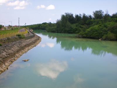 宮古島に移住してシーカヤックコース昨日のブログで伊良部大橋の建設現場写真を掲載しましたが、撮影した場所から、素人向けのシーカヤック(2人乗り)で水路・海を漕ぎ進む事が出来ます。「宮古島シーカヤック倶楽部」というお店で、浜辺の前にあります。以前、家内と一緒に楽しんだ事がありましたので、今日はそのコースを紹介します。漕ぎ出す前に、ライフジャケット着用法・オールの持ち方と操作の仕方などを簡単に教えてもらいます。早々、カヤックに乗り込むんですが、少し不安がありながらも期待にワクワクします。2~3分すると、なんとなく要領が分かってきて、ある程度は思うように漕ぐ事ができました。浜辺を離れて左側に進んで堤防の向こう側に回り込みます。インストラクターの方のカヤックを先頭に1列になって漕ぎ進むと、すぐに水路に差し掛かります。 (左側は遊歩道です)この間、前進・後進・右折・左折・停止など、多少の余裕を持ってできるようになってきます。岸の岩場には、びっしりとアダンの木が生えていて、道路脇に植えられているアダンの木とは様子が全く違って見えます。(以前紹介した道路際のアダンの木と実)水際の岩の大半が、水面から少し上の方までえぐられたようにへこんでいます。以前はここが波打ち際だったんです。その波打ち際だけを残して埋立地にしたので、現在は水路状になっているわけです。素人にとっては波がないので、シーカヤック操作が楽ですが、水の流れが弱くなった事で、以前よりも水が多少濁り気味です。それでも時々魚が水面を跳ねたり、水鳥がえさを探したりする様子を見る事が出来ます。先を進んで行くと、橋が見えてきます。この橋をくぐりぬけて更に進むんですが、橋の欄干にはカジキマグロが描かれていました。途中、所々でインストラクターの方が説明してくれたり、写真を撮ってくれたりと、大サービスです。更に進んでいくと、大きく右に迂回しています。その先には、かっての波で根元をほとんど削り取られてしまった岩が垂直に立っています。長い年月、激しい波にさらされてきたんでしょう。よく、倒れないもんだと感心しますが、自然の妙と言えるでしょう。この先で水路が終わり、目の前に海が広がります。海に出てすぐの所に、岩場が陥没して丸い池状になった所があります。海とつながっていて、出入り口の上には橋の様に細長い岩が乗っかっています。奥の池には、様々な魚やサンゴがいて、手に取るように見え、このコースの中では最も綺麗です。が、残念ながら今回は写真を撮れませんでした。上の写真は去年撮影のものです。ここから先は、埋立地の堤防の外側に回り込んで、外海に出ます。 (左は埋立地の堤防、向こう側は伊良部島)波が荒いと無理ですが、静かであれば大丈夫です。こうして、約2時間かけてシーカヤックのちょっとした冒険が終わり、出発地点の浜辺に帰りつくと、曇りの日でも、結構日焼けしてしまいますので、女性は日焼け対策が必要ですよ。