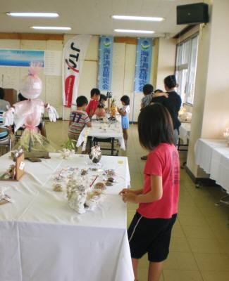 宮古島に移住して漂着物アートコンクール作品表記のコンクルール紹介も3日目です。これまで入賞作品のみを紹介してきましたが、会場の様子も紹介したいと思います。やっと台風8号が去って雨も上がった展示最終日という事もありますし、授賞式前という事もあって、見学者がたくさん来ていました。綺麗ね!とか、どういう風に作ってるんでしょうね!とか、きっと色々話しながら見ておられるんでしょう。いよいよ授賞式が始まりました。賞状を受け取っておられる人(右の黄色い服の方)が、今年度の大賞受賞者です。 さて、入賞作品は2日間にわたって紹介してきましたが、他にもいい作品がたくさんありました。どれも素晴らしいんですが、あえて数点、私好みを挙げさせてもらいますと、海草で作ったしおりです。形に変化があって面白いし、色も鮮やかでした。沢山のプラスティック製浮き玉に模様を描いていて、流木に花が咲いたようです。浜辺を汚している漁具とは思えません。かわいいお子さんの作品です。いかにも楽しそうに笑っている様子が、素晴らしいです!この作品は入賞しても良かったのに!と思いました。最後に紹介する作品は、私的にはかなり上位の入賞作品に匹敵する出来栄えだと思っています。それが、これです。沢山の小さな巻貝を使って、開口部を口に見立て、眼を付けてあります。大勢の家族・友人・知人と一緒になって、楽しそうに笑顔を振りまいている様子が出ていて、大好きな作品です。 紹介し出すとキリがありませんのでこの辺でおしまいとします。最後に私の感想ですが、大人に交じって大勢の小さな子供たちが出展していたのが、微笑ましくもあり、今後の宮古の自然の美しさ保全に光を見たような気持になれた、いいイベントでした。