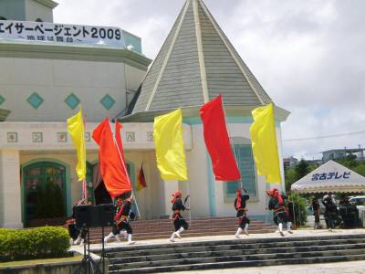 宮古島に移住してエイサーページェント クライマックスこの2日間、様々なエイサーの演舞をご紹介してきましたが、今日はページェント最後を飾るエイサー一斉演舞です。というのも、沖縄本島・石垣島・波照間島など国内11か所と、ハワイ・テキサスを含めた13か所の会場をインターネットで結び、同時に踊ろうという企画です。時刻は午後3時過ぎですが、テキサスは時差の関係で午前1時。深夜に大声あげて、太鼓をたたいて大丈夫?と思っていたんですが、日本食レストランを会場にし、周囲の地域住民の理解も得てあるとの事でした。国内会場も天候が悪くて、急遽屋内会場に変更したりと、見えない所での苦労もあったようです。しかし、宮古島は晴天です。すぐそばに浜辺が見える絶好のロケーションですが、日蔭がない!イベント的には最高ですが、とにかく暑いのでお土産屋さんでかき氷を食べていると、宮古テレビアナウンサーの司会進行役の方が「もうすぐ始まりますので、一般参加の方たちは広場に集まってください」と言っています。私も大急ぎで広場へ移動しました。本島の那覇・テキサス・石垣島・波照間島など、各会場の様子が紹介されて行きます。そして、いよいよ始まります。一般参加の人たちは舞台前の広場で、琉球国祭り太鼓の皆さん方は階段と舞台上に並んで、演舞が始まりました。一般参加の子供たちも元気です。大きい声を出し、太鼓を勢いよく叩いて、覚えたステップを踏んで・・・。観客席のお母さん方は、我が子や知り合いの子供の姿を求めてシャッターを切りつづけていました。毎日練習して覚えた演舞です。時には思うようにできず泣いたり、できるようになって大喜びしたり。きっと、そういう事もあったんでしょう。その成果を出し切ろう!!宮古会場の最年少は4歳児です。石垣では1歳児が踊ったとか。また1年生が大太鼓で演舞したと聞いています。こんなに小さい時から、生まれ故郷の伝統行事に参加し、体で覚える。こんなにいい地域教育はないです。都会では失われて久しいものが目の前では生きている。すばらしい!!少し高い場所に移動して撮影しました。舞台上の琉球国祭り太鼓のみなさんも、炎天下の日差しに負けず頑張っています。その動きや姿勢は、どこか空手のそれに似ています。宮古だけでなく全13か所の皆さんが同時に踊り終わりました。御苦労さん!お疲れ様!そして、良かったよおーー!!最後に、キンダーハウス前に全員で整列。記念撮影です。司会の方が「観客の皆さんも前に出て記念撮影してください」と告げると、指導者・お母さん方・観光客の方々が一斉に前へ出て、シャッターを切り続けていました。いいイベントでした。おおいに満足しました。 さあー、この後は午後4時から始まっている「オリオンビアフェスト2009 IN 宮古」に、大急ぎで駆けつけなければ。その様子は明日のブログで紹介しますので、また見に来てください!!