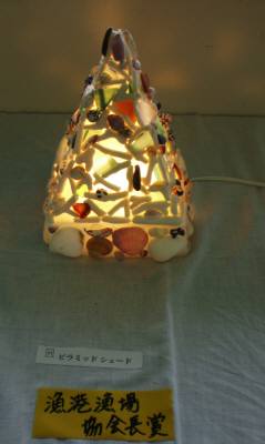 宮古島に移住して漂着物アートコンクール 2昨日に続いて、漂着物アートコンクール2009に出展された主な作品のご紹介です。沖縄県漁港漁場協会賞を受賞した「ピラミッドシェード」です。貝・ビーチグラス・サンゴを上手に組み合わせて、ピラミッドのように見えます。次は宮古島観光協会長賞に輝いた「ハリセンボンみーつけた!」です。大きい目とトゲをタカラ貝につけて、かわいいハリセンボンになっています。気持が和むいい作品です。更に、宮古島漁業協同組合長賞は「海くじゃく」でした。繊細な海藻を使って、孔雀の羽根を見事に表現しています。宮古テレビ賞を受けたのは「親子クジラ」と「あしひれマンタ」です。ペットボトルを上手に使って、親子のクジラが表現されています。右側の訪朝の様な物がマンタのヒレですが、撮影時気付きませんでした。ごめんなさい。ホテルアトールエメラルド賞は「みんなでみた皆既日食」です。いろんな貝などで作った物が写っていないので分かりづらくてすみません。JTA賞をもらったのは「ペットボトルの世界旅行」でしたが、撮影し忘れていました。紹介できなくて残念です! この他にも入選作品がたくさんありましたが、明日は私が気に入った未紹介の作品を掲載したいと思います。