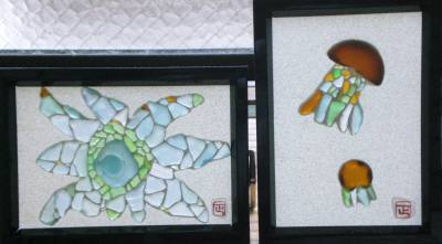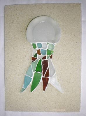 宮古島に移住してビーチグラス絵の落款このところ、ビーチグラス絵の話題が途切れていましたのは、新作ができないためでした。題材としては、1.函館の夜景、2.星型の文様、3.ハイビスカス などがあったんですが・・・。いざ、取りかかってみるとどれも結構難しくて、途中で挫折!!おまけに、ハイビスカスの花を作ろうと作業途中だったガラスを、足の親指で踏んだ様で、バシッいう小さな音と共に割れてしまいました。それやこれやで意気消沈していたんですが、先日、漂着物アートコンクルールで見た人の中で“欲しい”という人が2人も出てきました。そこで気分一新して、作ってみようと思っている今日この頃です。とりあえず、以前からプロ作家の方や他にも数人の方々から言われていた「落款」を作って、作品に貼る事にしました。と言っても、白いビーチグラス(比較的四角くて平らな物)に書くので、インクでは滲んでしまいます(表面に細かい無数のギズがあるため)。顔料系や朱肉用の物だと、粘度があってペンでは書けません。仕方なく、顔料系の物を極細の筆で書く事にしました。あまり上手じゃないので落款風に見えません。それでも、やっぱり有る方がいいのか?近づいて見てみると、こんな感じなんですけど。かなり特訓する必要がありそうですが、小さい物を一つ、新たに作ってみました。定番の“クラゲ”です。真ん中に落款を付けたのは、ビーチグラスで形造ったクラゲの周りの空白部分に砂付けするため、微粉状の砂を振りかけ終わった瞬間に、汗がポタッと落ちて、そこだけ砂の付き方がいびつに・・・・。大失敗ですが、どうする事もできません。仕方ないので、その場所に落款のビーチグラスを上から貼ったというのが本当の理由です。