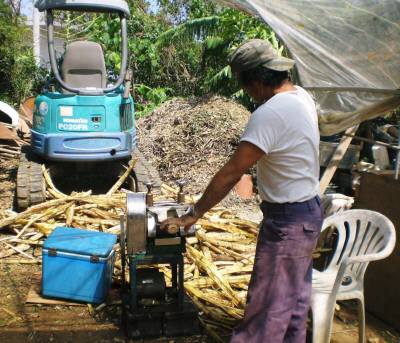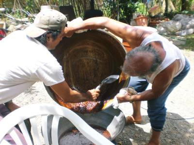 宮古島に移住して黒糖シロップ作り昨日のブログで紹介したお宅のご主人が近所の友人の方と2人で黒糖とシロップを作られると聞いて、出かけて行きました。お宅に着くと、すでにサトウキビのしぼり汁を煮詰めている所でした。わざわざ「最初の工程から見せてあげよう」と言って、サトウキビを絞ってくれました。絞り汁は水色のクーラーに入り、絞りカスは機械の向こう側に出て行きます。絞ってすぐの汁を飲ませてもらいました。当然甘いんですが、ほんの少しだけ酸味があるようにも思えました。やはり、濃厚で美味しい!手前のドラム缶で煮詰めているのは「黒糖シロップ」を作るためで、奥で火が燃えている窯の方で「黒糖」を作っています。絞り汁を固めるため石灰をはじめに入れるんですが、量を少なくして煮詰め、液の温度を低めにすると、黒糖シロップができます。ドラム缶では太い木を燃やしても空気の流れが充分でないので、温度が上がりにくく、黒糖作りに適していません。しかし、それがシロップ作りに適しているそうです。8月中旬の正午過ぎです。日差しがジリジリと刺すような中で、火加減調整とアク取りが延々と続きます。日蔭を選んで、大型扇風機に当たっての作業ですが、汗が流れます。適宜お茶や水などを飲みながら、木を燃やし続ける事約3時間。当初の量の3分の1程度にまで減って、ブクブクと沸騰しています。温度計で、液の温度が所定温度(100数度)になったのを確認すると、ドラム缶から外して、別の鍋に移します。しばらく置いて粗熱を取り、柄杓とジョーロで容器に移し替え、すぐに水で冷やします。続いて、すぐに後かたづけです。シロップ作りに使った鍋を水でしっかり洗って、シロップ作りが完了です。とにかく、お二人の手際の良さと息のあった連携によって、流れるように作業が進み、ただただ感心しました。 できたてほやほやのシロップを飲ませてもらいました。サトウキビのしぼり汁を飲んだとき「甘い、濃厚」と思ったんですが、こちらのはトロンとしていて、甘さ・濃厚さ共に数段上です。まさにシロップ!!泡盛・料理・おやつ・かき氷にと、どんなものに掛けても、≪グー!!≫です。当然、薄めて氷を浮かべてジュース感覚で飲んでも美味しいです。薄めても、サトウキビのしぼり汁とはまた一味違います。何といっても無添加、無着色、地産地消、出来たてホヤホヤです。こんな贅沢は、都会では味わえません。シロップ、1本いただきました。このブログ入力中も、シロップ+氷+水=ジュースを飲みながらやってます。 明日はいよいよ黒糖作り工程のご紹介をしたいと思います。