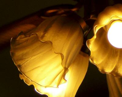 宮古島に移住してブログの話題が・・・・いよいよ、ブログの話題がなくなってしまいました。これまでもこうした事は何度かあったんですが、そういう時は、撮り溜めておいた花などを紹介してたんです。しかし、移住後1年2か月以上になると、新しいい花が見当たりません。今日はブログを休憩しようかとも思ったんですが・・・・・。 朝・晩の食事は自宅で食べますが、お昼ごはんはほとんど食堂などで食べています。最近、一番よく行くレストランの天井からぶら下がっている照明器具を撮影してみました。何の変哲もない極普通の照明器具です。が、実は、「ビーチグラス絵の素材にならないかなあ」と思って撮影したので、照明器具の一部しか写っていません。どことなく、つりがね草のように思えましたので。という事で、一つだけを改めてアップで撮影です。他のお客さんの迷惑にならないように、フラッシュは使いませんでした。距離があってズームで撮ったからか、本当は明るい店内なのに、随分と暗い大人の雰囲気が漂っています。実際は、昼食(日替わりランチでアイスコーヒー付き=650円)の最中だったんですが。周りにお客さんがいなくなったのを見計らって、フラッシュをたいて撮影してみますと、フラッシュの光が反射して、白くなりました。同じ物を、同じ距離で、同じカメラで撮影したとは思えない位、色が違って見えます。写真の面白さであり、怖さでもあります。 この写真を、近くのコンビニで拡大コピーして、ビーチグラス絵の下書き用を作ったのが下の写真です。どこか、もっさりとした感じで気分がスッキリとしません。という事で、これは少しそのままにして、別途小さめのクラゲを作りました。 「つりがね草」をいつになったら作りだすのか、自分でも????です。 (苦し紛れの話題に付き合っていただいて、ありがとうございました)