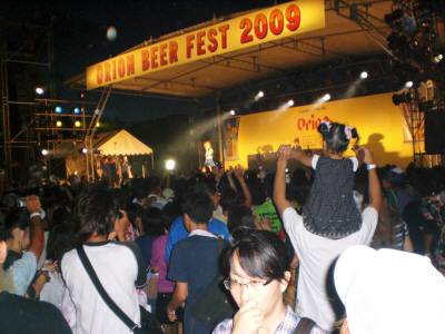宮古島に移住してオリオンビアフェスト台風8号が先島諸島に接近中です。(ヤシの葉が右に激しく揺れています)そんな中、午前中に歯医者へ行ってきました。移動中はそれほどの風雨でもなかったんですが、治療を終わって外に出てみると風が強くなっていました。周期的に風雨が強くなり、明日の朝にかけて暴風雨圏内に入るようです。(強風が右の壁にあたって跳ね返りサトウキビを 倒している)水不足が心配されていたので多少の雨は歓迎ですが、被害がない事を祈っています。私はというと、最低限の食料を買い込んで自宅にこもる事にしました。 今日の話題はエイサーページェント2009と同じく8月2日の夕方から行われた「オリオンビアフェスト2009 IN 宮古」です。午後5時前に自宅を出て、ショッピングセンター前のバス停へ行きました。というのも、飲酒運転防止のため、オリオンビールがバスを手配しピストン運転してくれているんです。そのバスが大型の観光バスで、冷房もバッチリです。島に移り住んでバスに乗る事がなくなったので、久しぶりです。座席もフカフカ!あっという間に会場に到着しました。宮古島市民球場に隣接した多目的運動場が会場です。駐車場の先へ歩いて行くとゲートがあります。そこで、免許証など顔写真入りの書類を見せてリストバンドをもらいます。オリオンビール主催の感謝企画なんですが、未成年者の飲酒は問題です。という事で、リストバンドをした成人だけがビール(謝恩価格で)を飲めるという仕組みです。会場の両側にはテントがずらりと並んでいて、オリオンビール販売コーナーと様々な屋台のコーナーになっています。舞台上では丁度太鼓演奏が終わって、次郎グループが出てきた所でした。さらに、宮古島を拠点にして活躍中のハーベスタが会場のみんなを一気に盛り上げます。雲が茜色に染まり始めた頃には、広いグラウンドもかなり人で埋まって来ました。主催者のあいさつやオリオンビールキャンペンガールの3人へのインタビューなど、いろいろと盛沢山の内容でイベントが進むうちにも、続々と観客が詰めかけています。メーンイベントであるBENIさん(オリオンビールCM出演、着歌No1歌手)のライブ前に、オリオンビール・タコ焼き・枝豆等を買うため、売店コーナーへ行ってきました。どれも美味しそうです。 BENIさんのライブは明日のブログで紹介します。 (一段と風雨が激しくなって、ビュービューという音も 大きくなってきました・・・・・・・・・・・17時30分現在)