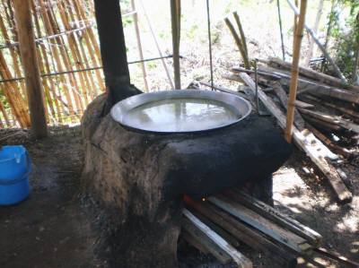 宮古島に移住して黒糖作りの工程今日は朝から出かけてきました。行先は沖縄電力宮古支店の敷地内にある野球場です。宮古・八重山の少年野球チームが一堂に集まって毎年行われている野球大会です。その様子は、後日報告したいと思っています。 さて、今日の話題ですが、 昨日の黒糖シロップ作りに続いて、今日はいよいよ黒糖作りの紹介です。13日のブログで、≪サトウキビを絞って、大きな鍋状の容器に入れて、窯の上に乗せて、火を付けて、煮詰め始める≫所までは紹介しました。その後ですが、絞り汁が多かったからか、窯に火を入れてから小1時間経っても沸騰しません。どうしてかな?と思っていると、作業をしておられるご主人とお友達が何やら話されていて、鍋の底のすすを落とし始めました。すすが底に付着していると、液の温度が上がらないんだそうです。落としたとたんに沸騰して、ブクブクと泡立ち始めました。すすは炭素そのもので、熱を通しにくい性質があります。なので、地球へ帰還時のスペースシャトル外壁を空気との摩擦熱から守るためにに塗布してあるほどです。そうした炭素の性質を経験からご存じのお二人の知恵に感心してしまいました。湯気が立ち始めてからも、火加減を見ては材木をくべていきます。先日の台風8号で折れた木の枝はたくさんあるんですが、火力が弱いそうです。そのため、家屋の解体があると廃材をもらってきて貯めておくんだそうです。沸騰が続くと、たくさんのアクが出てきます。そのアクをすくっては取り、すくっては取り、何度も々繰り返します。上の写真の釜も小屋も全てご主人の手作りです。「手作りシートー屋」「ンマイ窯」と書いた表示がぶら下がっています。これは「手作り砂糖屋」「おいしい(黒糖ができる)窯」といった意味合いで付けたと言っておられました。表示板の下にコップと小さな皿があるのが分かるでしょうか?窯の字の下です。お神酒とお供えです。窯に火を入れる前に、「火の神様」に安全をお祈りして供えるのを欠かさないとおっしゃっていました。ガスコンロのスイッチを何気なくひねっている私たちが忘れた事を、いろいろと大切に守っておられる気持ち・姿勢に接して、背筋が伸びる思いでした。更に材木をくべて煮詰めていきますと、泡が盛り上がってきます。そうすると、大きな柄杓でかき混ぜます。空気に液を触れさせて温度を少し下げ、泡立ちを押さえます。これも、泡立ちの状況を見ながら、何度も繰り返します。と同時に、液の温度を見ているんだと思います。120度強まで液温を上げるんですが、最終段階に近くなると、温度計で確認します。 (手に持っておられる棒状の物が温度計)いよいよ、最終段階です。最初の液量の半分以下になっています。温泉のxxx地獄そっくりの泡が、ブクッ・ブクッと出て、いい匂いがしています。温度計で最終確認して、長かった煮詰め作業が終わりました。窯に火を入れてから、約4時間の作業でした。 この後に固める作業が待っているんですが、ブログが少し長くなってしまいましたので、以降は明日の紹介とします。