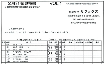 明日25日(水)に2月度お見積書を送信予定です! 少量入荷予定のアイテムも多いので、ご入り用の商品はお早目にご発注・ご予約下さい。 ご発注お待ちしています! リラックス営業部!