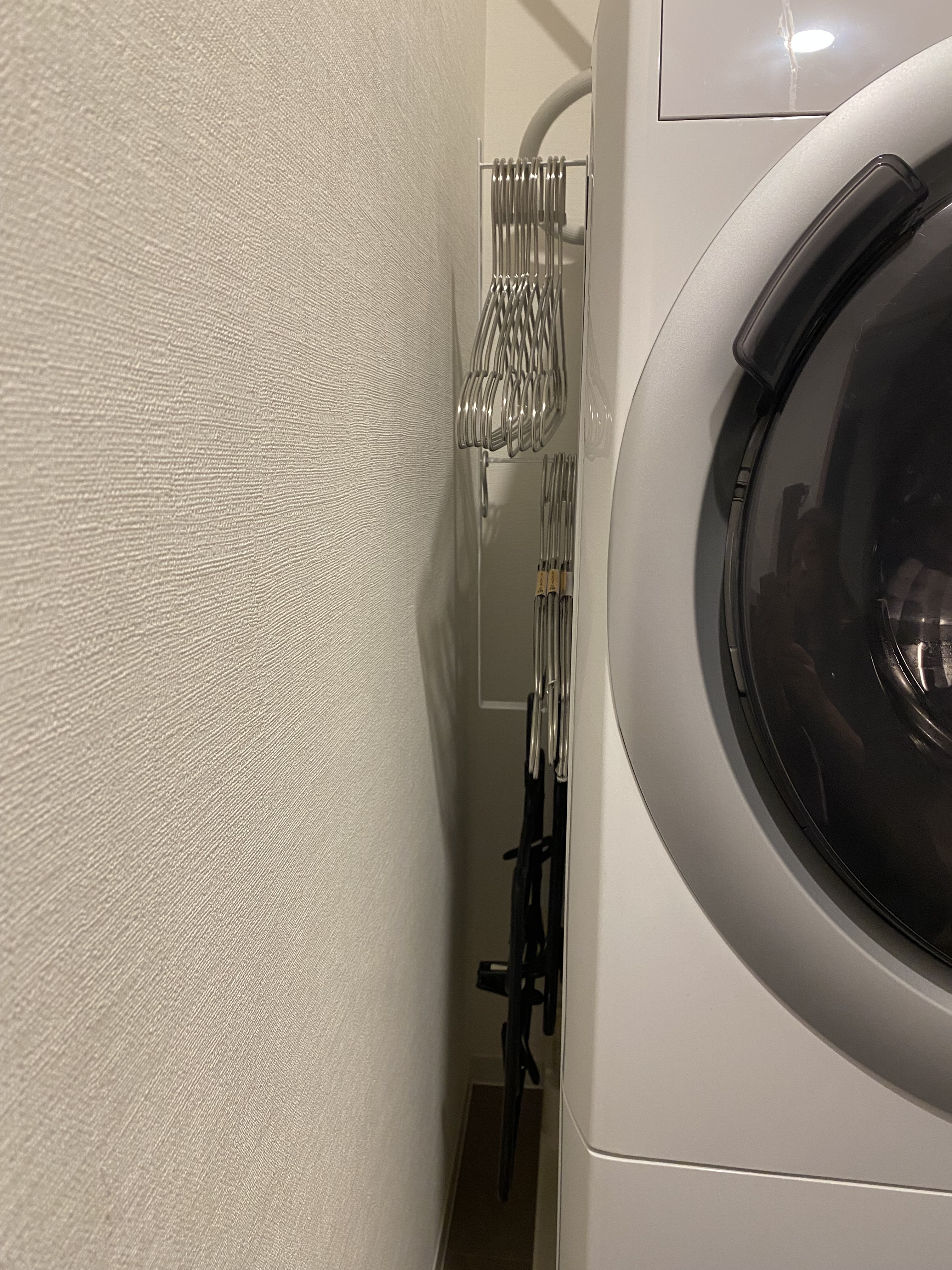 狭い隙間でもマグネットで洗濯機本体に取り付けられて20近くのワイヤーハンガーを掛けらます。 でもこれ、以前持っていたハンガーだと大きすぎでNGでした。それも10年近く使ってたのでどうせなら、と小さめハンガーに買い替えました。(ハンガーは因みにDAISO。)