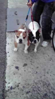 あんにょん♪ちゃんと毎日ブログを書こう!と決めたのに・・・やっぱり無理みたいです Σ( ̄□ ̄汗…)書きたいことは山のようにあるのにパソコンの間にいる時間もない・・・ほど 忙しいわけではないのですが (つω`●)そんな中 必ず毎日することがありますそれは・・・・サクラとミントの散歩 U。・ェ・。Uノ~ワン♪朝は 時間がほんと少ないのと日が明けるのが遅くなってきたのでほんの10分もないくらいの散歩(散歩といえるか??)でも夕方はがんばって 30分はウロウロするようにしていますそんななか サクラやミントにも友達ができました ((( ^-^)爻(^-^ )))(友達っていうか??)もともとサクラはかなりのビビリちゃんですたぶん自分は犬でなく人間と思っていると思うくらい犬に逢うと ほんと!嫌な顔をするんですでもこの頃は ちゃんと挨拶もできるように??なったかな???基本はダックスちゃんが好きたぶん 目線が同じだからかな?上から目線は嫌いみたいです遠くに犬が見えると。。。立ち止まる一応 クルリと回って帰ろうとするε=ε=ε=ヾ(*´Д`)ノ逃げろォォォォでも無理なら。。。じっと立ち止まっておく相手が自分と同じようなら。。。犬の挨拶??においをかぐ無理!でかい!!!!となったら じっと相手が通り過ぎるのを待つわたしのほうが強いかも!?と思ったら たまに吠えるミントは・・・だれでも アタック!!吠えたり 挨拶したり 騒いだりもうせわしない・・・・・そんなミントが近づかなかったのは この2匹フレンチブルの 『ジュジュ』ブルの 『デン』シェパ-ドでも吠えてアタックしていくミントがシッポを中にいれて 近づかないもちろん サクラは私に抱かれてますでもこの『でん』 まだ5ヶ月くらいなのですだけど 体はもう10キロ越えかるくサクラミント2匹分をこえてますそして。。声がまだ子供なので 高い!体は大きいのに 声が高いから吠えたときに 誰が吠えたかわからないくらい1時間も立ち話してたでしょうか?そろそろ慣れたかな?と思ってみたけどやっぱり無理でした『でん』は30キロは超えるらしい・・・次会うときは どんなだろうな??飼い主ばかりがよろこんでいるのでしょうか(笑)