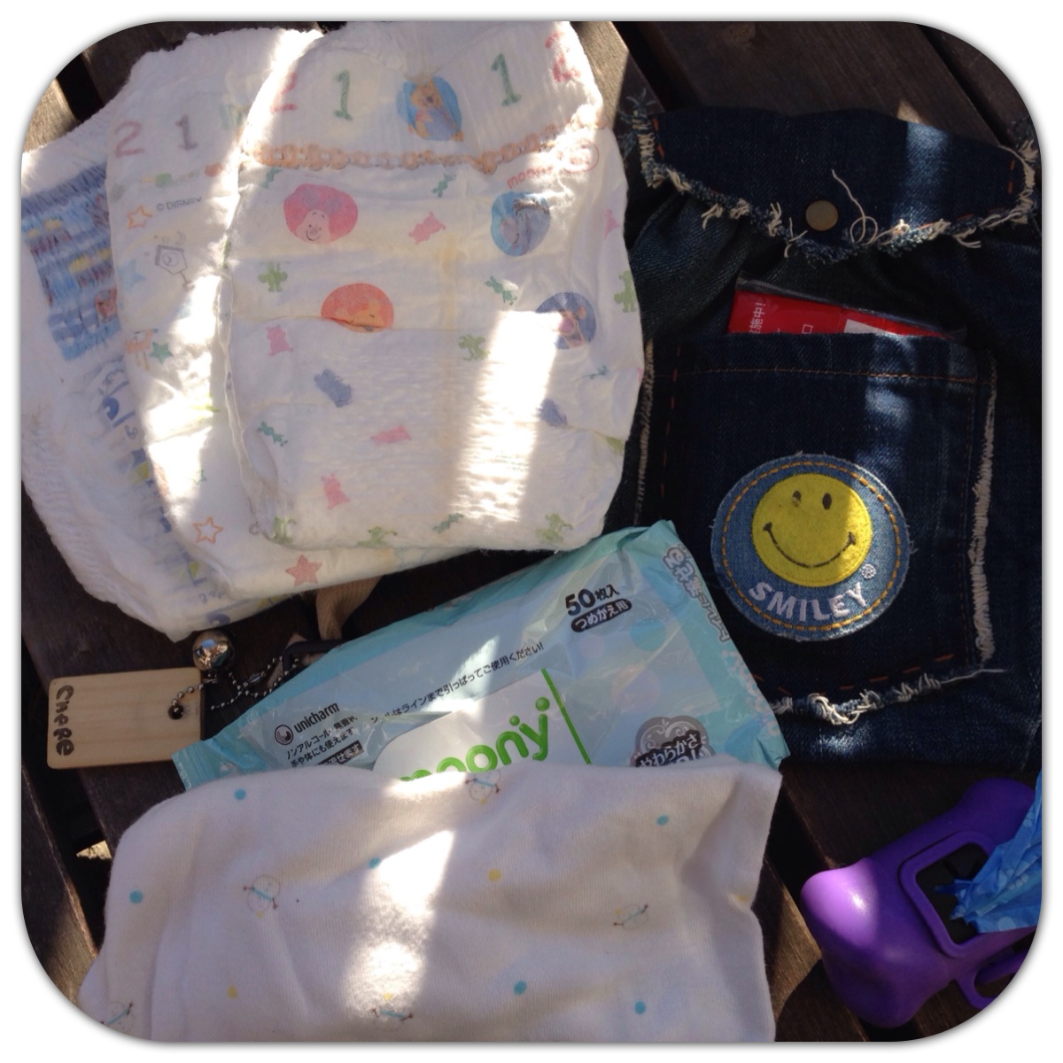 Cooちゃんは、オムツ(Lサイズテープorパンツ2〜3枚)とおしり拭き、肌着、ゴミ袋を入れています。