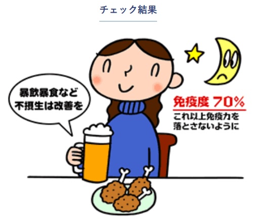 (最低気温3℃ 最高気温12℃)昨日は、朝から鼻水が止まらないので風邪薬を飲んで風呂もやめて夜は早く寝ました。今日もくしゃみが出たり鼻水が止まらないなどの症状が出ています。(午後からは治まってきました。)寒暖差アレルギーかとも思いましたが免疫力の低下もあるかもしれません。ネットで免疫力の低下について調べていたら、大正製薬のHPに免疫力診断があったのでやってみたところ、↓このような結果が出ました。 (結果の文章も出てきますが、省略しました。) これ以上免疫力を下げてはいけないようです。免疫力を上げないといけませんね。↓免疫力チェック (大正製薬)https://www.taisho-kenko.com/check/271/↓免疫力を高めるには? (アリナミン製薬)https://alinamin-kenko.jp/navi/navi_kizi_immunity.html最近、運動らしいことをしていなくて昼寝の時間が多かったり、お昼ご飯をしっかり食べてないのがいけないのかもしれませんね。ーーーーーーーーーーーーーーーーーーーーーーーーーーーーーーコタツ布団の上で丸くなって昼寝中のソラニャン。 一昨日?は、ソラニャンもくしゃみをしていてなかなか止まりませんでした。鼻水くしゃみは、免疫力の低下ばかりとは限りませんが、運動不足は間違いないので体を動かすことを考えないといけませんね。以 上