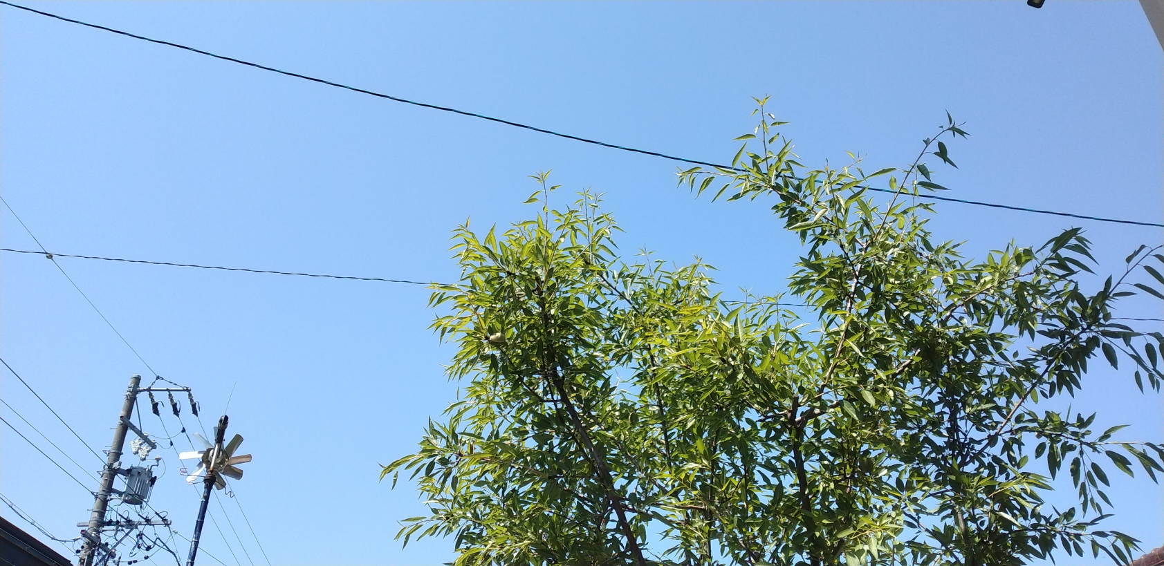 / 一時 (最低気温8℃ 最高気温18℃)午前中はまずまずの良い天気でしたが、徐々に風が強くなってきて午後には短時間ですが強い雨が降りました。午前中に買い物に行ってきましたが、川沿いの桜はほとんど葉桜になっています。今年の桜の花もこれで完全に終わりのようです。12時半頃の空。 アーモンドの木が強い風に煽られています。昨日の雨と今日の雨風でアーモンドの花の実になりかけている部分が次々に落ちています。 矢印くらいの大きさの実に成長しているのは無事で、ざっと数個はあります。 昨年はアーモンドが出来るまでに成長したのは1個だけでしたが、今年は2,3個くらいはいけそうな気がします。↓昨年8月にアーモンドの実が割れた時のブログ。https://plaza.rakuten.co.jp/reosoranikki/diary/202408200000/一時横殴りの雨が降ったので洗濯物を見にベランダにいったら、ちいさな蛾が息子のポロシャツにとまって避難していました。今日は肌寒いので、ソラニャンがお母さんのベッド布団に潜り込んだまま出てきません。以 上