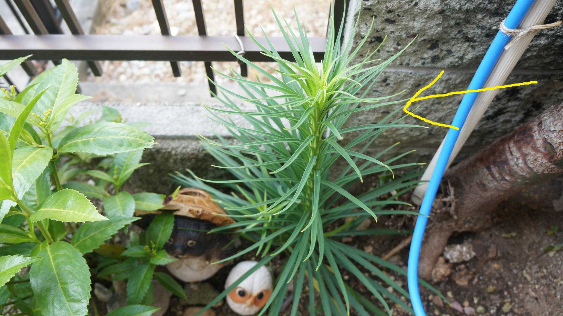 (最低気温25℃ 最高気温33℃)朝、外に出たらご近所からセミの鳴き声が聞こえてきました。我が家の庭のギンモクセイからはまだ聞こえてきませんが、昨年に剪定して木の高さを低くしたのでセミの居場所がないのかもしれません?セミが鳴いていたのは朝方の短時間だけで、その後は静かになりました。暑いけど天気がいいのは気持ちが良いです。 9時頃の空。バッタの赤ちゃんを発見。新しい雑草が生えてきました。(黄色の矢印) グーグルレンズで調べたら、”クワクサ(クワ科)”のようです。(雑草)庭に勝手に生えて来た草が背を伸ばしてきました。 グーグルレンズで調べると”ユリ”の仲間のようです。 このまま様子を見ていれば、ユリの花が見えるかも??????ーーーーーーーーーーーーーーーーーーーーーーーーーーーーーーーーーーーー猫タワーで寝ているソラニャン。 この部屋の室温30℃です。今日は、息子も休みなので一日のんびりと過ごしています。明日は、子供会の資源回収に出す新聞雑誌を縛ったり、生協の注文書の記入などをしようと思います。午後からは、お母さんのところに洗濯物を届ける予定です。(雨が心配ですが降りだすのは夜になってからのようです。)以 上