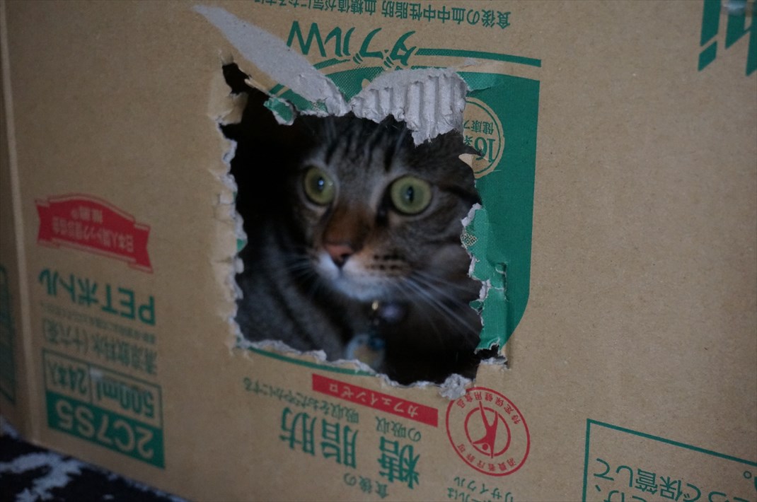 ダンボールの中から外を伺うソラニャン。 猫戦車で遊んでくれません......