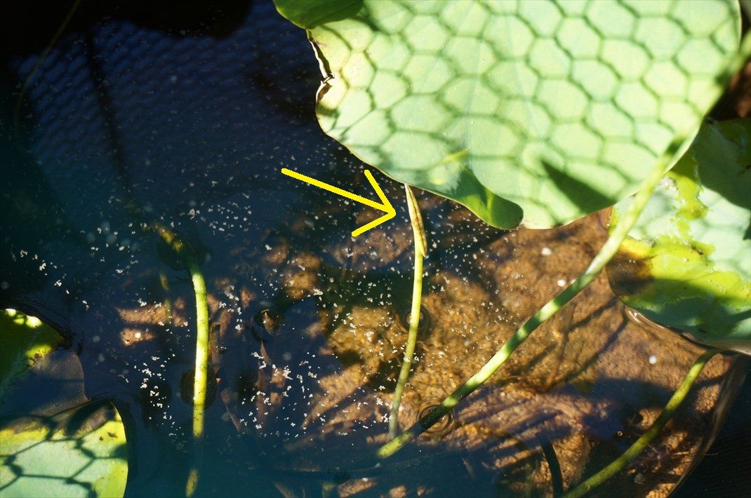 水面に浮かんでいる粉はメダカのエサです。